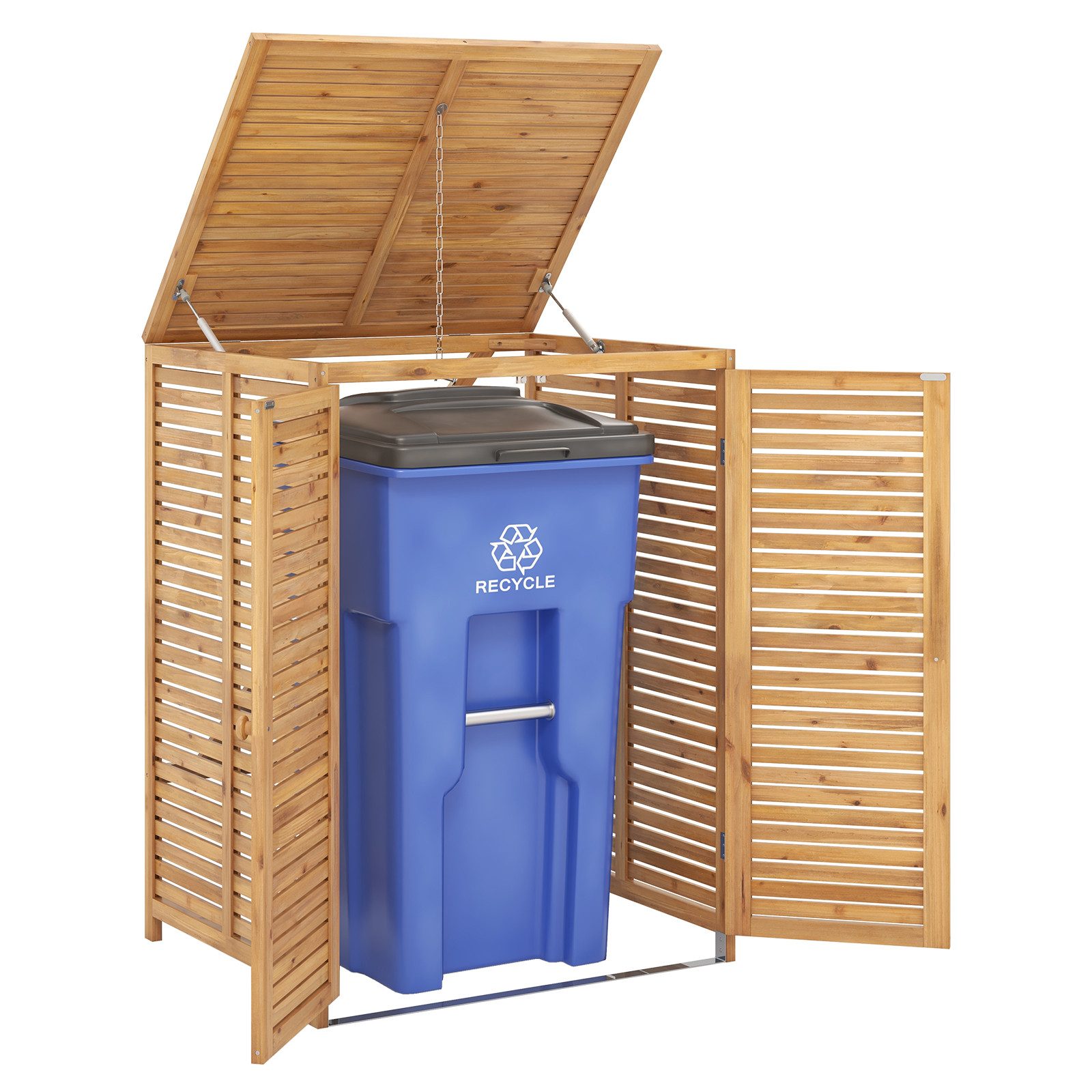 Unser Mülltonnenhaus bietet eine hervorragende Müllentsorgung im Freien. Mit praktischen Vordertüren und einem Hebedeckel für müheloses Einlegen und Abrufen der Mülltonnen. Die Metallkette verbindet den Deckel des Hauses mit dem der Mülltonne, automatisch öffnend, wenn das Haus zugänglich ist. Der Riegel schützt Ihre Sachen vor Tieren. Das belüftete Design vermeidet unangenehme Gerüche. Aus hochwertigem Fichtenholz gefertigt und mit wasserbasierter Farbe behandelt, ist die Holzmülltonne haltbar und naturnah. Mit einer Kapazität von 120 Litern passen die meisten Standard-Mülltonnen ins Haus. Der Schuppen kann auch zur Aufbewahrung von Outdoor-Ausrüstung verwendet werden.