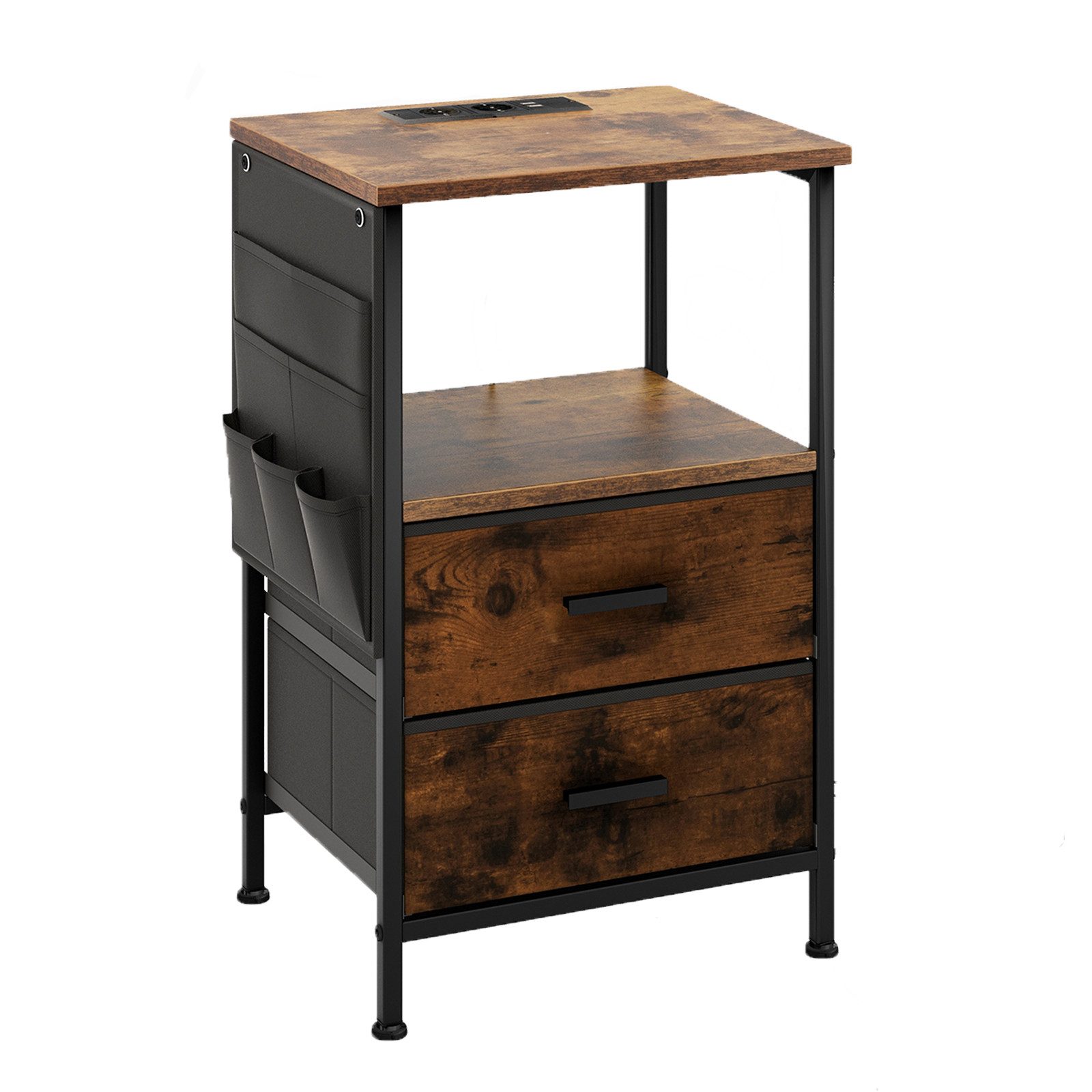 Dieser elegante und moderne Nachttisch wurde speziell für Ihre Bedürfnisse entwickelt und verfügt über eine 4-Port-Ladestation zum Aufladen aller Ihrer Geräte. Dieser Nachttisch ist auch ein wahres Stauraum-Kraftpaket mit einer geräumigen Tischplatte, einem offenen Regal, 2 geräumigen Schubladen und 6 Seitentaschen. Endlich können Sie alle wichtigen Dinge ordentlich organisiert und griffbereit aufbewahren. Unser Nachttisch besticht durch seine rustikale Eleganz. Seine warme Holzmaserung passt gut zum mattschwarzen Rahmen und verleiht jeder Dekoration einen Hauch von Raffinesse. Darüber hinaus ist er mit einem stabilen Metallrahmen auf Langlebigkeit ausgelegt und mit verstellbaren Fußpolstern für zusätzliche Stabilität ausgestattet.