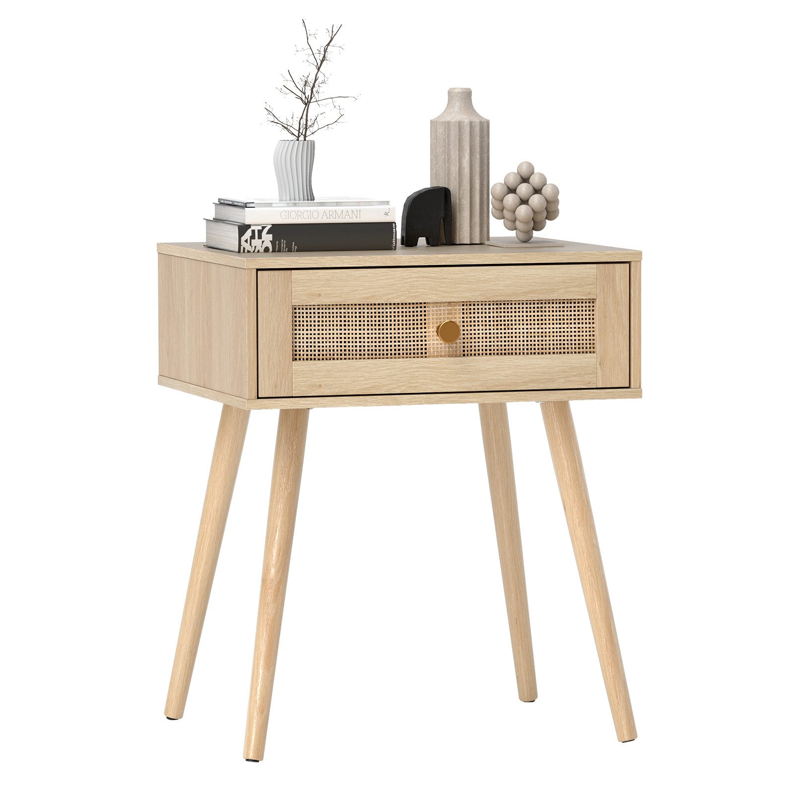Dieser Nachttisch, ausgestattet mit einer handgewebten, natürlichen Rattan-verzierten Schublade und einer reichen Holzmaserungsoberfläche, bringt einen Hauch von naturinspiriertem Charme in jedes Zimmer. Die großzügige Tischplatte und die Schublade bieten ausreichend Stauraum für Ihre Essentials und machen ihn zu einem idealen Möbelstück für verschiedene Anwendungen, sei es als Beistelltisch, Kaffeetisch oder Akzentstück.