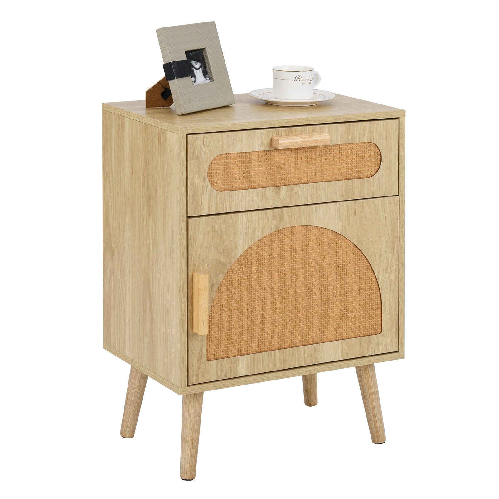 Verwandeln Sie Ihr Zuhause mit Boho-Eleganz! Entdecken Sie den Charme unseres modernen Nachttisches aus Rattan– eine perfekte Kombination aus Stil und Funktionalität. Dieses exquisit gestaltete Möbelstück bringt mit seiner Rattan-verzierten Schublade und Tür einen Hauch von rustikalem Flair und glatten, klaren Linien, die jeden Raum aufwerten. Es bietet auch zahlreiche Aufbewahrungsmöglichkeiten mit einer geräumigen Tischplatte, einer Schublade und reichlich Stauraum im Schrank.