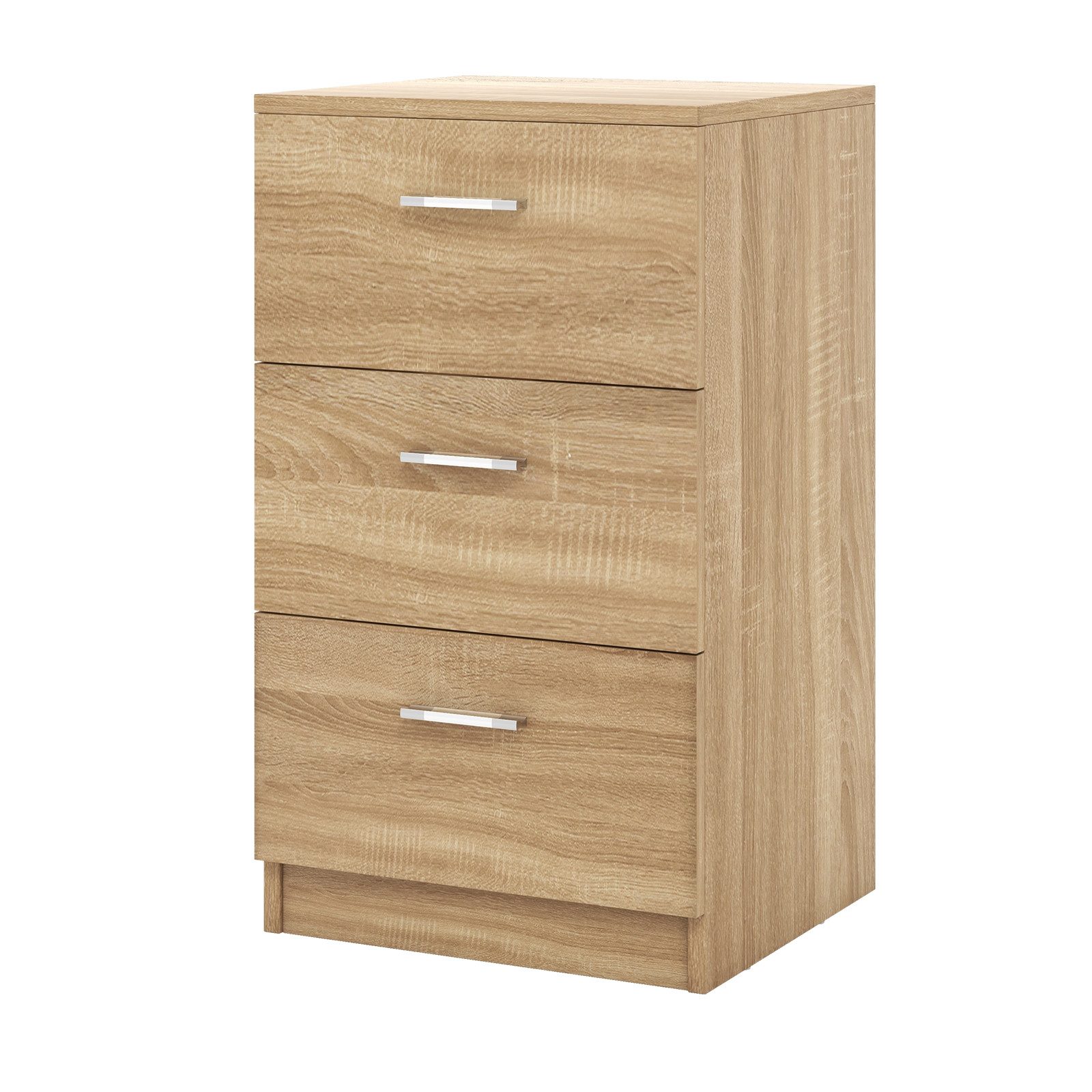 Die Nachtkommode besteht aus hochwertiger Spanplatte, damit ist sie robust, pflegeleicht und langlebig.