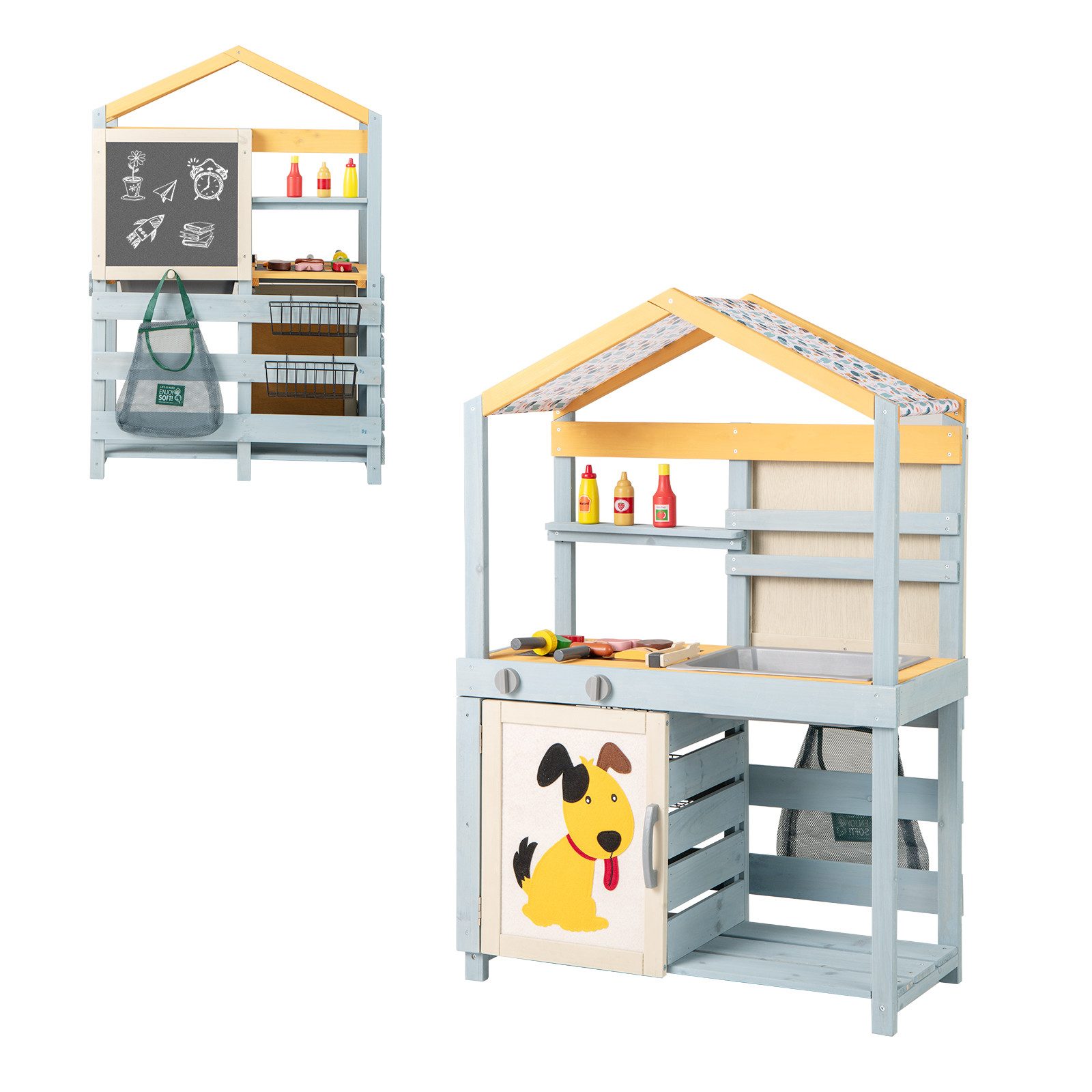 Unsere 2-in-1 Holz-Matschküche sorgt für noch mehr Spaß beim Rollenspiel! Diese Outdoor-Spielküche aus robustem Fichtenholz ist langlebig und sicher. Kinder können sich in der Matschküche und im Lebensmittelgeschäft austoben. Der Grill ist mit Lebensmitteln und Werkzeugen ausgestattet, sodass die Kinder köstliche Mahlzeiten zubereiten können. Eine Tafel zum Schreiben und Malen regt die Kreativität an. Die Spüle, der Herd, offene Regale, eine Aufbewahrungstasche und Metallkörbe schaffen ein realistisches Koch- und Einkaufserlebnis in einem aufgeräumten Spielbereich. Geeignet für Kinder ab 3 Jahren, ist dieses Outdoor-Spielset ein ideales Geschenk zur Förderung der Fantasie.