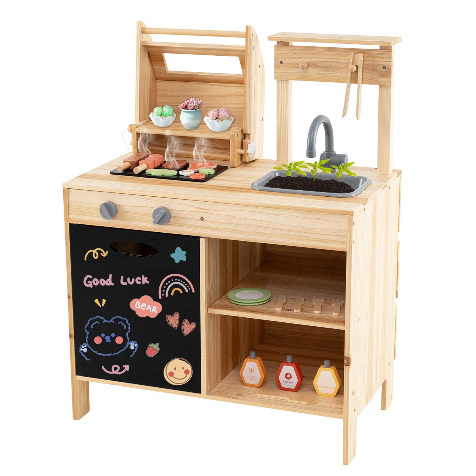 Hergestellt aus zuverlässigem Fichtenholz, ist dieses Grillspielset für die Kinderküche für langanhaltenden Spielspaß gebaut. Kinder können Spaß daran haben, Gemüse im Waschbecken zu waschen und auf dem Grill zu brutzeln, komplett mit Lebensmitteln und Utensilien für ein realistisches Kocherlebnis. Die Tafel mit Kreide und einem Radiergummi bringt ein weiteres unterhaltsames Element hinzu. Wenn das Spiel vorbei ist, können die Kinder ihre Zubehörteile im integrierten Stauraum verstauen. Sie können ihren Grill sogar mit Farbe personalisieren.