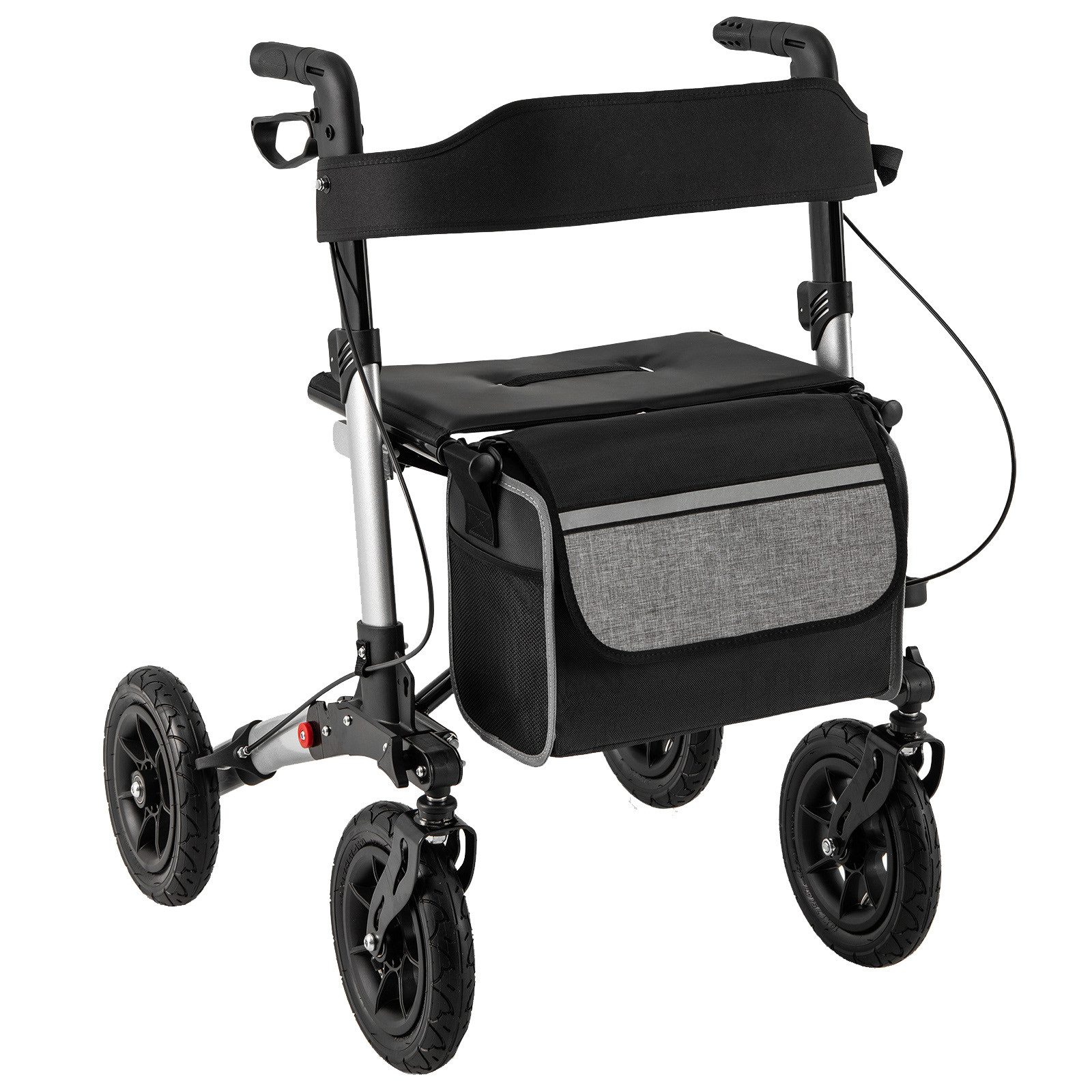 Dieser Gehwagen verfügt über eine leichte und dennoch robuste Aluminiumkonstruktion und einen einzigartigen Klappmechanismus für einfache Lagerung und Transport. Die geländegängigen Luftreifen sorgen für sanftes und leises Rollen im Innen- und Außenbereich, während die verstellbare Griffhöhe an verschiedene Benutzer angepasst werden kann. Dank des vielseitigen Bremssystems für Kontrolle und Sicherheit sowie der komfortablen Rückenlehne und der breiten Sitzfläche bietet dieser Rollator Senioren Unabhängigkeit und ein angenehmes Gefühl beim Laufen.