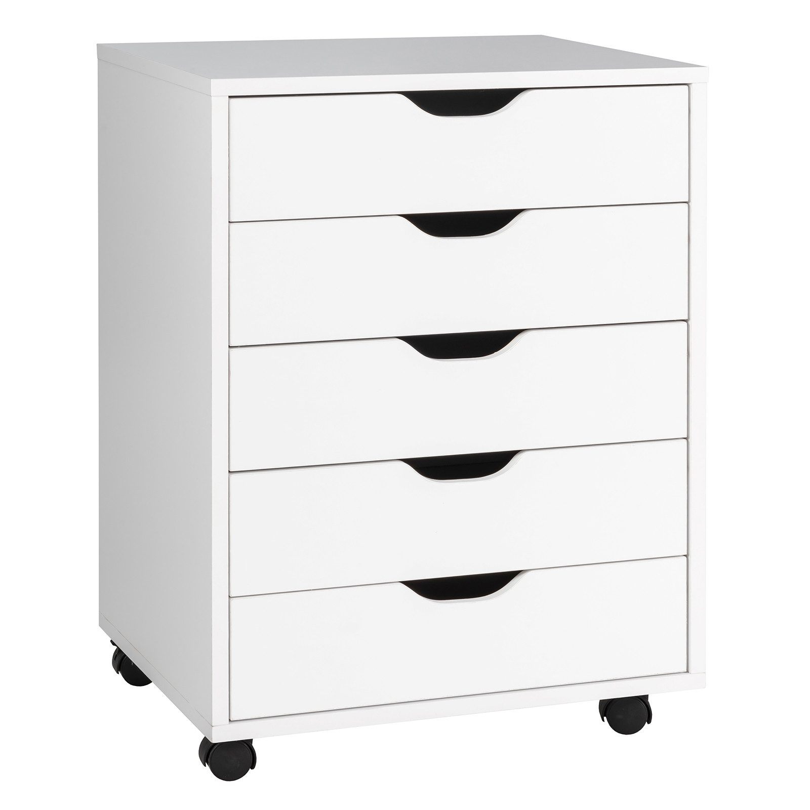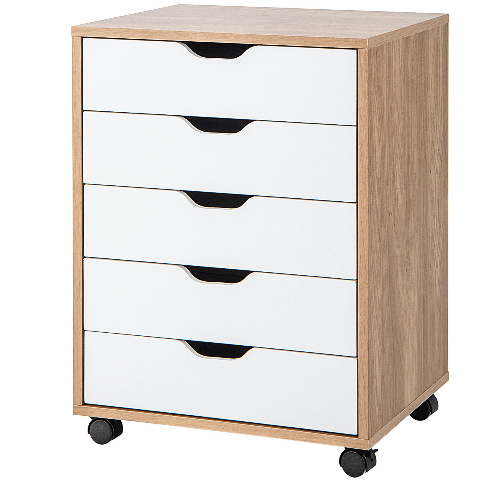 Aus Holzwerkstoffen gefertigt ist er sehr langlebig. 5 große Schubladen bieten Ihnen zudem viel Stauraum für Dokumente, Snacks, Kosmetika, etc. Durch die glatten Schienen und Griffe lassen sie sich leicht öffnen und schließen. Der Bürocontainer hat vier um 360° drehbare Rollen, durch die er mobil ist. Sie können bei Bedarf aber auch abgenommen werden. Dank der verständlichen Anleitung kann der Schrank schnell und einfach montiert werden.
