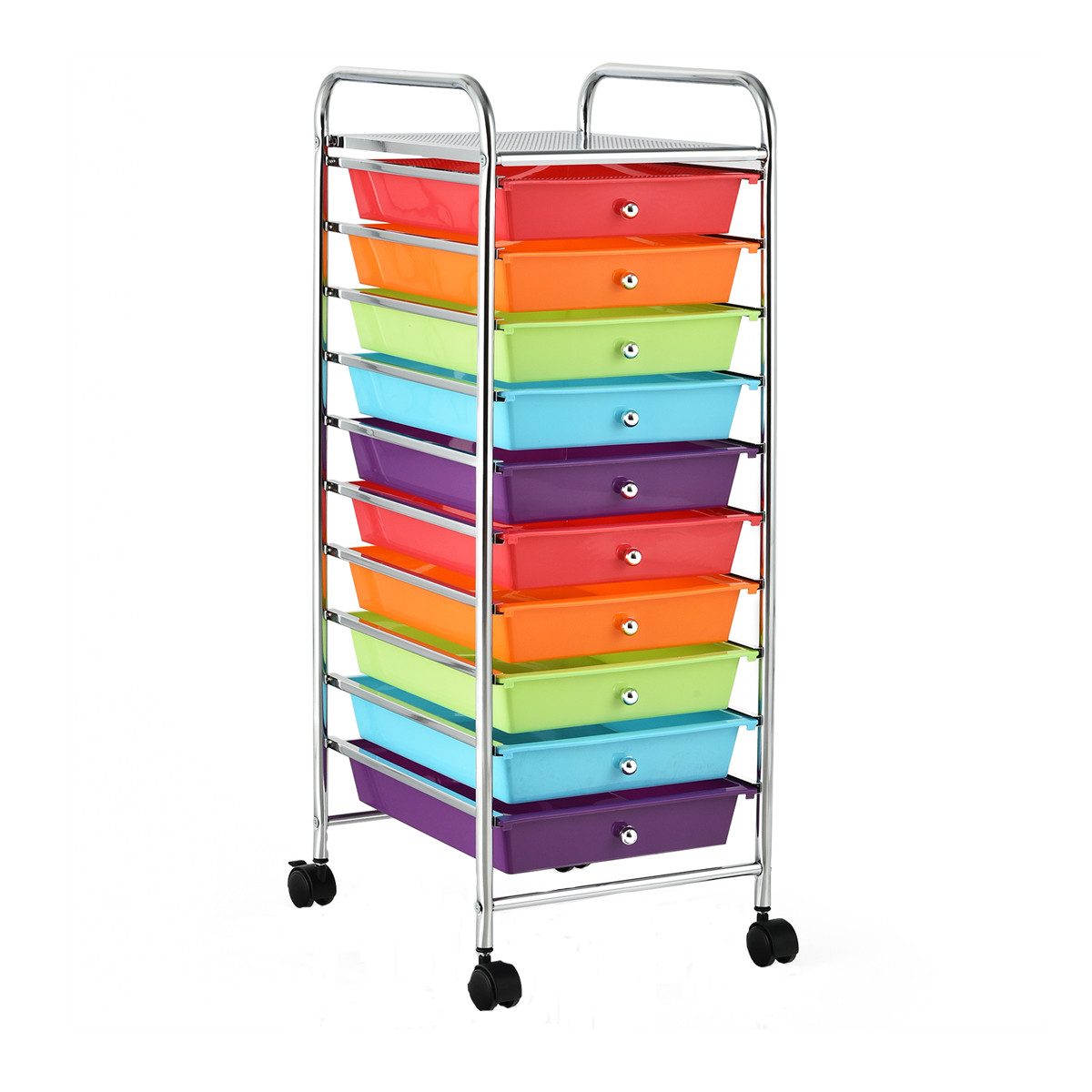 Der Bad-Rollwagen ist vielseitig einsetzbar. Im Bad für Kosmetikartikel und Handtücher, beim Friseur für Lockenwickler, Haarspangen und -bürsten usw. oder aber auch im Büro für Schreibutensilien, Büroklammern, Briefumschläge und vielem mehr. Mit seinen 10 Schubladen aus Kunststoff und einer Ablagefläche, bietet der Rollcontainer ausreichend Platz um Ihre Utensilien zu verstauen. Durch die 4 Rollen ist der Rollwagen sehr beweglich und kann in jede Ecke gestellt werden.
