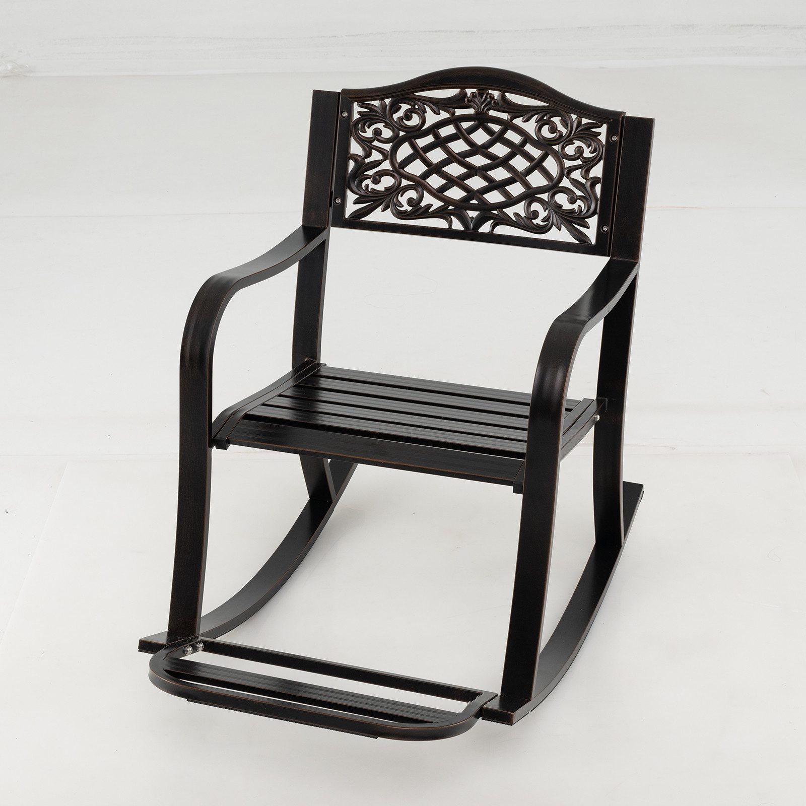 Hervorragend gefertigt aus hochwertigem Gusseisen, ist dieser robuste und rostfreie Schaukelstuhl darauf ausgelegt, intensiven Außeneinsatz zu überstehen und gleichzeitig eine stabile, sichere und sanfte Schaukelbewegung zu bieten. Das ergonomische Design umfasst eine konturierte Sitzfläche und gebogene Armlehnen, ergänzt durch eine gemütliche Fußstütze und eine wunderschön detaillierte florale Rückenlehne. Ob am Pool, auf einer Garten-Terrasse oder auf einer ruhigen Veranda – dieser Schaukelstuhl mit seiner sorgfältigen Verarbeitung ist die perfekte Ergänzung für entspannende Momente und die Ruhe Ihres Außenbereichs.