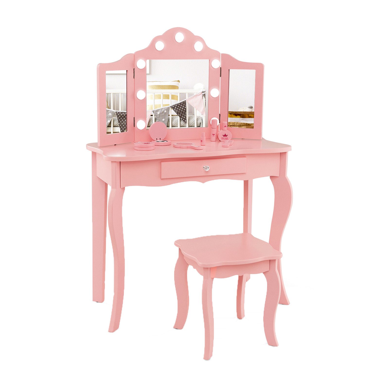 Der Schminktisch ist mit einem dreifach klappbaren silbernen Spiegel ausgestattet, der abgenommen werden kann, um den Tisch als Schreibtisch zu nutzen. Und der mittlere Spiegel ist mit dreifarbig dimmbaren LED-Lichtern bestückt, die ein realistisches Make-up-Erlebnis bieten. Mithilfe der Schublade unter der Tischplatte können Kinder ihre Kleinigkeiten gut verstauen. Abschließend kann dieses Schminktisch-Set für mehr Sicherheit mit der mitgelieferten Kippsicherung an der Wand befestigt werden.