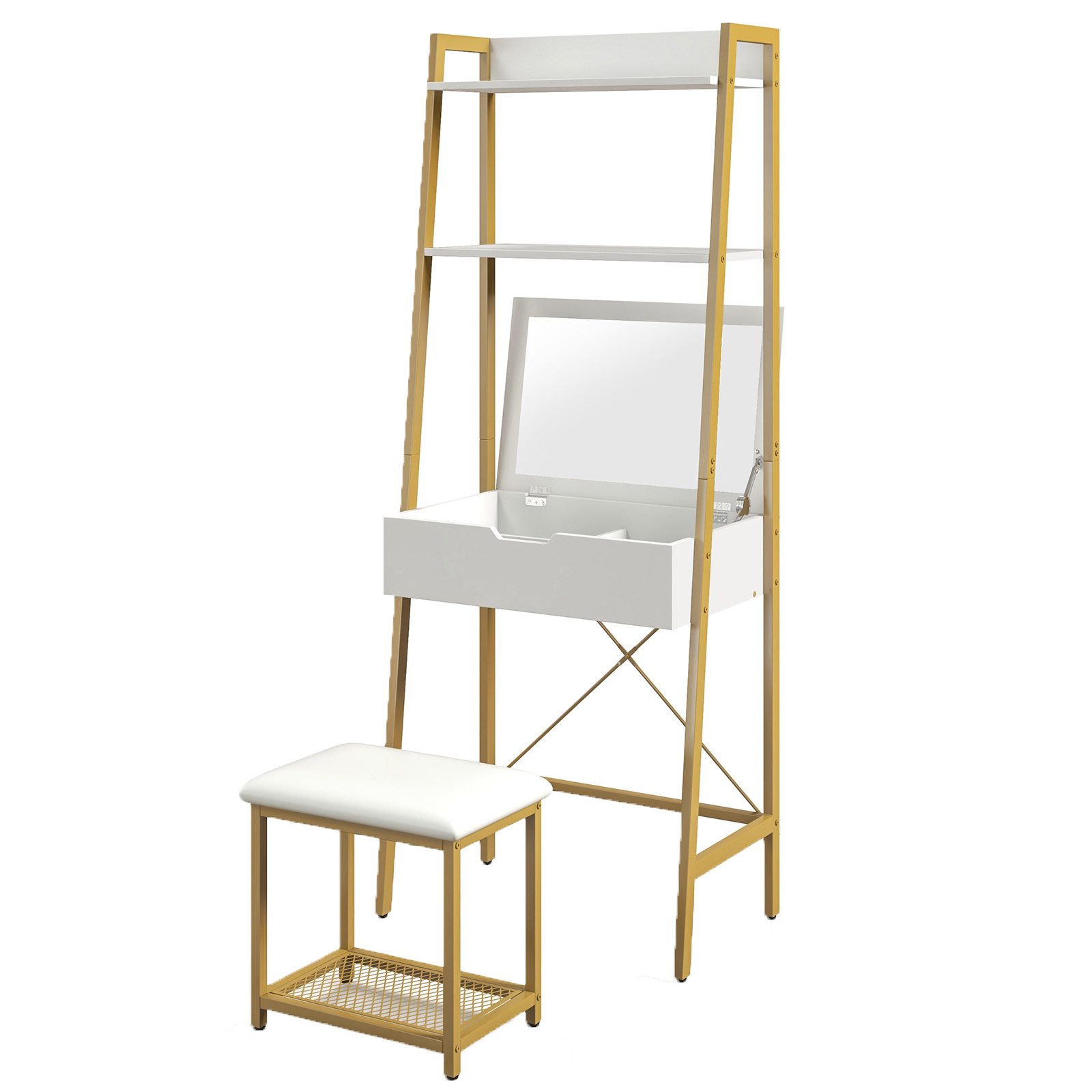 Mit einem aufklappbaren Spiegel lässt sich dieser Leiterschreibtisch ganz einfach in einen Schminktisch verwandeln. Der Schminktisch ist mit 2 Regalen und 4 unabhängigen Ablagefächern unter der Tischplatte ausgestattet, um verschiedene und klassifizierte Aufbewahrungsmöglichkeiten zu bieten. Der Hocker ist außerdem ebenfalls mit einer Ablagefläche ausgestattet. Und das weiche Sitzkissen ist bequem für langes Sitzen. Für zusätzliche Sicherheit können Sie den Tisch mit der mitgelieferten Kippsicherung an der Wand befestigen.