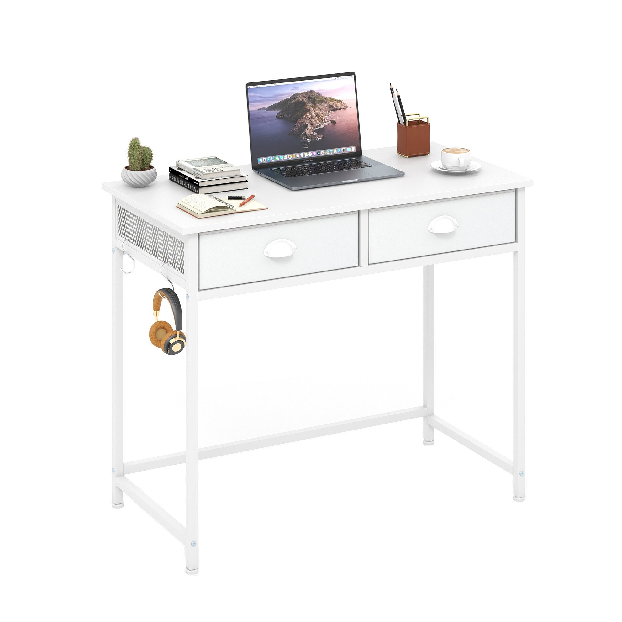 Der Schreibtisch enthält 2 Stoffschubladen und flexible Haken für eine praktische Aufbewahrung von Essentials wie Schreibwaren und Rucksäcken. Im Gegensatz zu wackeligen Schreibtischen ist der Computertisch mit einem robusten Metallrahmen gefertigt, der bis zu 111 kg tragen kann. Die kompakte Размер von 90 cm macht ihn ideal für kleine Räume. Der Tisch ist mit verstellbaren Fußpads für unebene Böden, einer bequemen Fußstütze für das Ausstrecken der Beine.