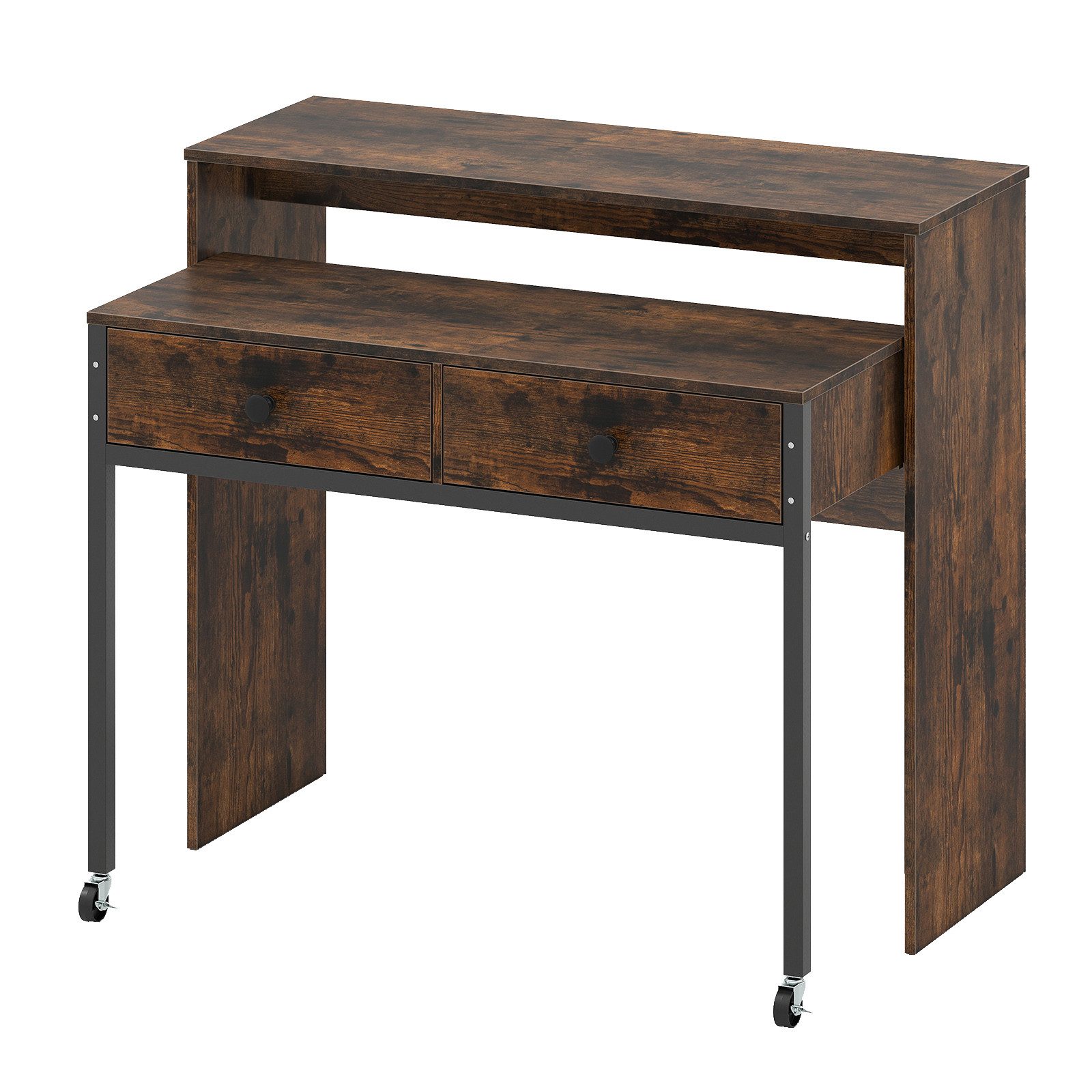 Ob fürs konzentrierte Arbeiten, als eleganter Schminktisch oder zur Präsentation von Deko im Wohnzimmer – das schlanke, platzsparende Design passt sich flexibel Ihren Bedürfnissen an. Bei Bedarf ausziehbar für mehr Arbeitsfläche, bei Platzmangel einfach kompakt zusammenschieben. Die arretierbaren Rollen sorgen für festen Stand. Die erhöhte Ablage bringt den Monitor auf Augenhöhe oder dient als Stauraum. Zwei praktische Schubladen halten Ordnung und vermeiden Chaos. Ideal für ein geschäftiges Homeoffice, ein ruhiges Schlafzimmer oder ein lebendiges Wohnzimmer – holen Sie sich dieses praktische Möbelstück nach Hause!
