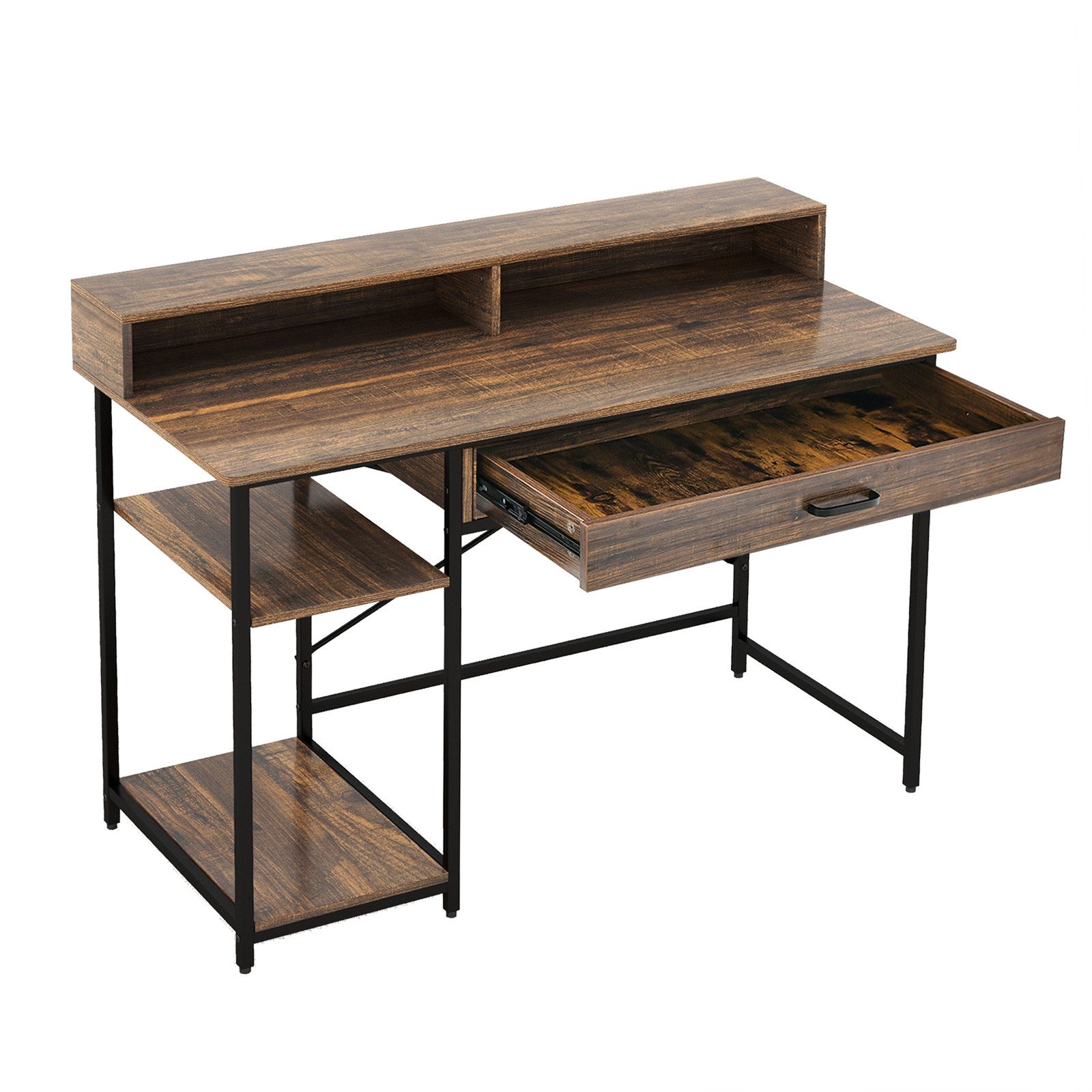 Steigern Sie die Produktivität und organisieren Sie Ihren Raum mit unserem Computertisch! Verabschieden Sie sich von schlechter Haltung und Rückenschmerzen mit der perfekten Betrachtungshöhe, die der Monitorständer bietet. Außerdem kann er auch als Aufbewahrungsregal für Topfpflanzen, Uhren, Lampen usw. dienen. Und mit der geräumigen Tischplatte, der großen Aufbewahrungsschublade und dem 2-stufigen Aufbewahrungsregal können Sie Arbeitsmaterialien und Gegenstände ordentlich organisieren. Rüsten Sie Ihr Zuhause, Büro oder Ihre Wohnung mit diesem multifunktionalen Schreibtisch auf, der sich perfekt zum Arbeiten, Lernen oder Spielen eignet.
