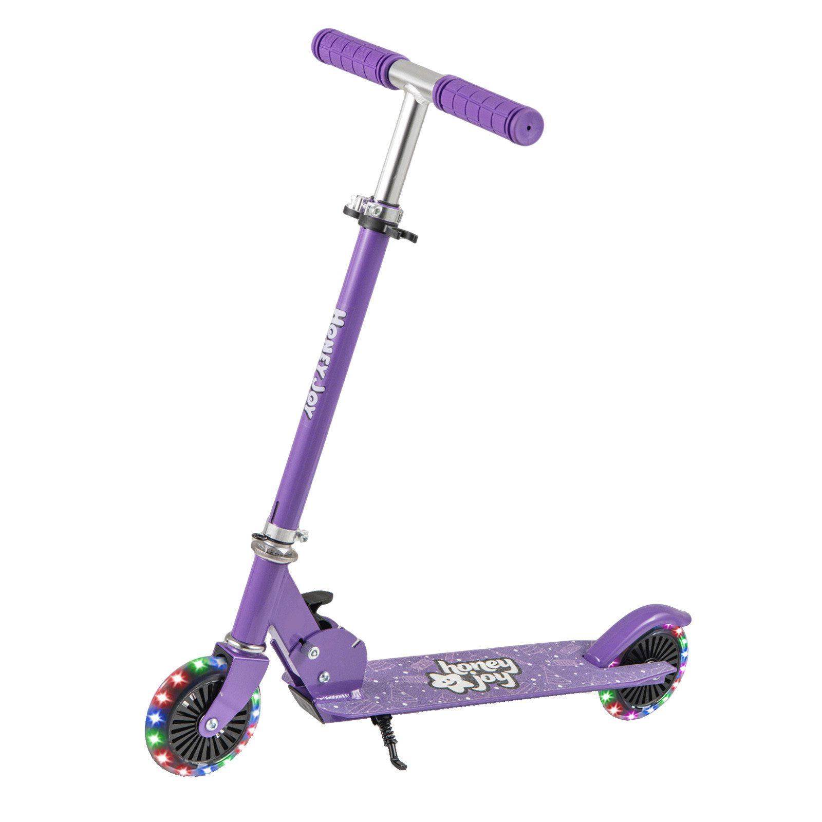 Genießen Sie eine sanfte und spaßige Fahrt mit unseren vielseitigen Kickrollern! Mit seinem in 3 Stufen verstellbaren Lenker passt sich dieser Kinderroller optimal an verschiedene Körpergrößen an. Die leuchtenden Räder funkeln bei jeder Bewegung und sorgen für zusätzlichen Fahrspaß und bessere Sichtbarkeit. Zudem bestehen die Räder aus verschleißfestem PU-Material für eine lange Lebensdauer. Die Sicherheit wird durch einen stabilen Ständer für einfaches Parken sowie eine zuverlässige Hinterradbremse für schnelles und sicheres Anhalten gewährleistet. Darüber hinaus erleichtert das klappbare Design mit dem mitgelieferten Tragegurt den Transport, sodass Eltern oder Kinder den Roller bequem über die Schulter hängen können, wenn er nicht genutzt wird. Mit niedlichen Mustern, die jedes Kind begeistern, ist dieser Kickroller ein perfektes Geschenk für Ihre Kleinen.