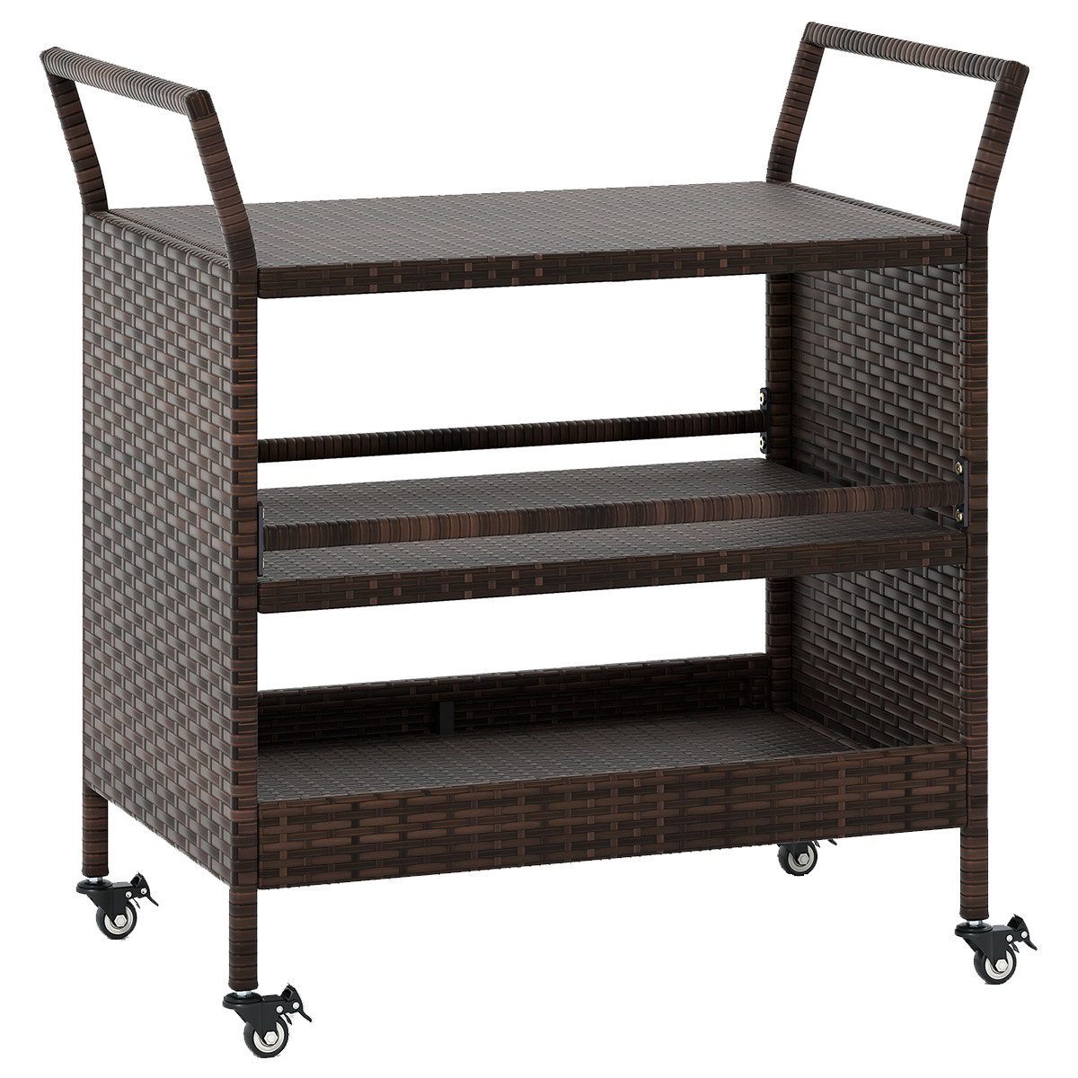 Aus hochwertigem, sonnenbeständigem und lichtbeständigem Rattan gefertigt, garantiert dieser Wagen Langlebigkeit und Schönheit. Die breite Arbeitsplatte und 2 untere Ablagen sind perfekt, um Geschirr, Getränke und Gewürze sicher zu halten. Mit leicht verwaltbaren arretierbaren Rädern und doppelten Seitengriffen, die auch als Handtuchhalter dienen, stehen Mobilität und Bequemlichkeit im Vordergrund dieses Designs. Ob bei einer sonnigen Poolparty oder einem gemütlichen Abendessen im Garten - dieser gut gemachte Barwagen vereint Funktionalität mit Eleganz und ist ein Muss für jeden Outdoor-Bereich.