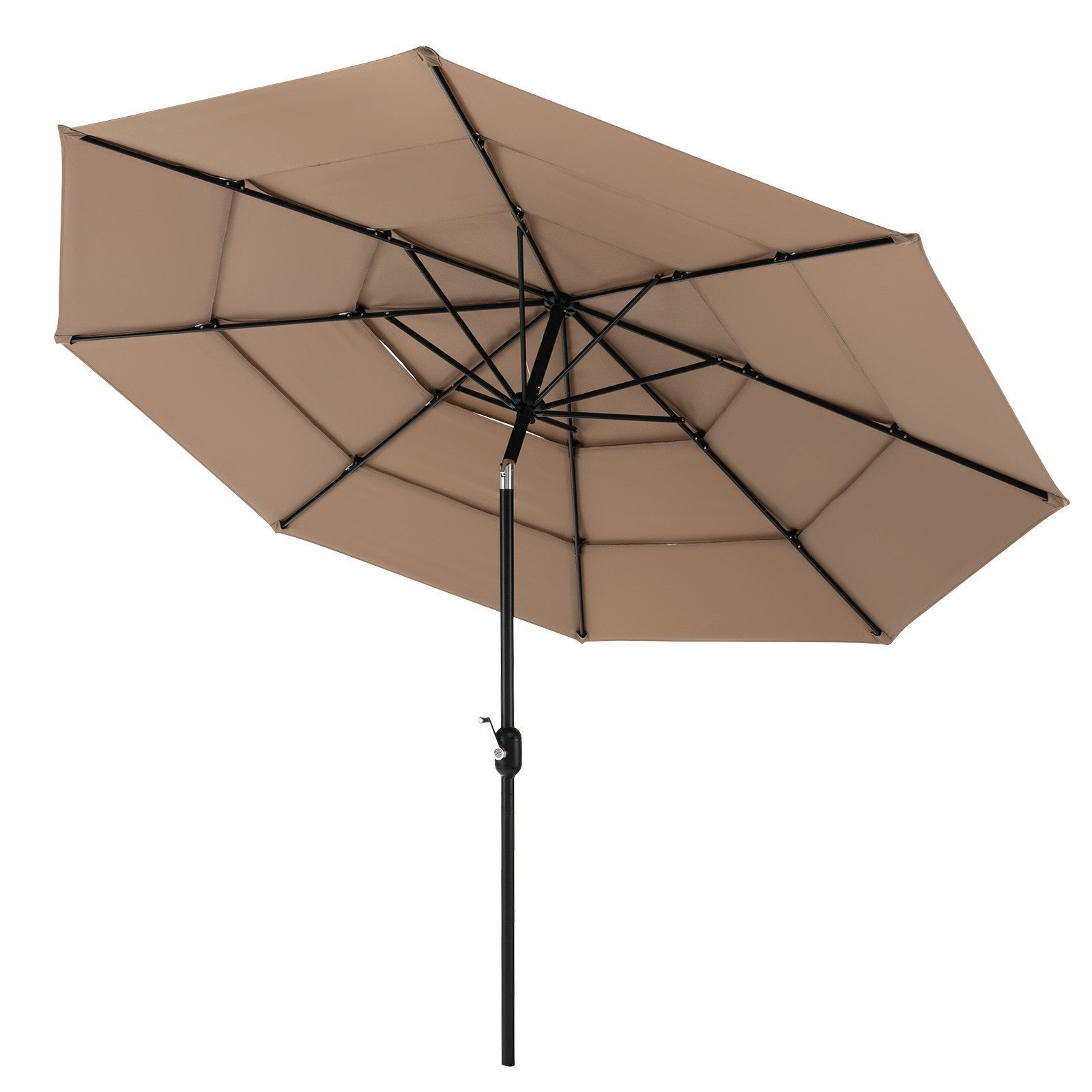 Sein Polyestergewebe mit PA-Beschichtung kann effektiv vor grellem Sonnenlicht schützen und leichtem Regen standhalten. Gleichzeitig zeichnet sich der Stoff durch hohe Farbechtheit und hervorragende Verschleißfestigkeit aus. Das Besondere ist, dass unser 3-stöckiger Sonnenschirm im Gegensatz zu einem gewöhnlichen Sonnenschirm eine doppelte Belüftung hat, die die Luftzirkulation fördert. Gestützt von einer stabilen Stange und acht stabilen Streben ist der 3-stöckige Outdoor-Schirm extrem stabil. Außerdem können Sie mit dem Druckknopf aus Aluminiumlegierung den Neigungsbereich von 45 Grad nach links oder rechts einstellen, um einen zufriedenstellenden Schattierungseffekt zu erzielen.