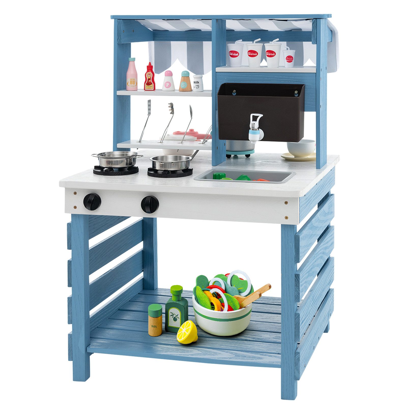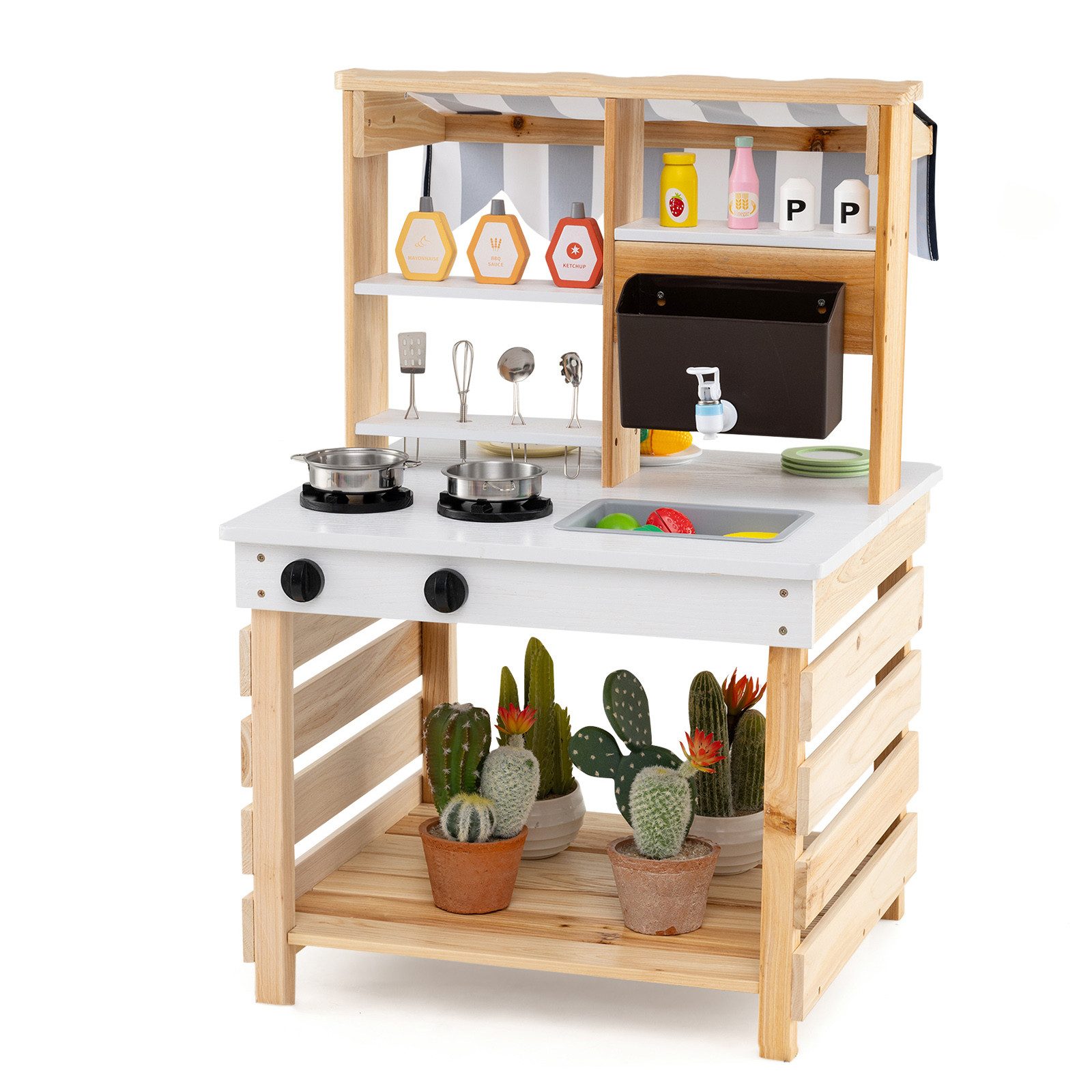 Dieses 2-in-1-Spielset aus Holz dient als Matschküche und Lebensmittelstand und bietet Kindern abwechslungsreiche Aktivitäten. Hergestellt aus robustem Tannenholz mit wasserbasierter Farbe und abgerundeten Kanten sorgt es für Sicherheit und Langlebigkeit. Das Spielset bietet vielfältige Spieloptionen – einen abnehmbaren Wasserkasten mit Wasserhahn, ein abnehmbares Spülbecken und zwei Herde mit Drehknöpfen sowie verschiedene Küchenutensilien, die Kindern ein intensives Kocherlebnis ermöglichen. Mit einem gestreiften Baldachin zum Schutz vor Witterungseinflüssen eignet sich das Spielküchenset perfekt zum Spielen im Freien. Sein großzügiges Fassungsvermögen trägt dazu bei, Ordnungsliebe und Organisationsfähigkeiten bei den Kleinen zu fördern. Es ist ideal für Kinder ab 3 Jahren und verspricht unzählige Stunden kreatives und fantasievolles Spielen.