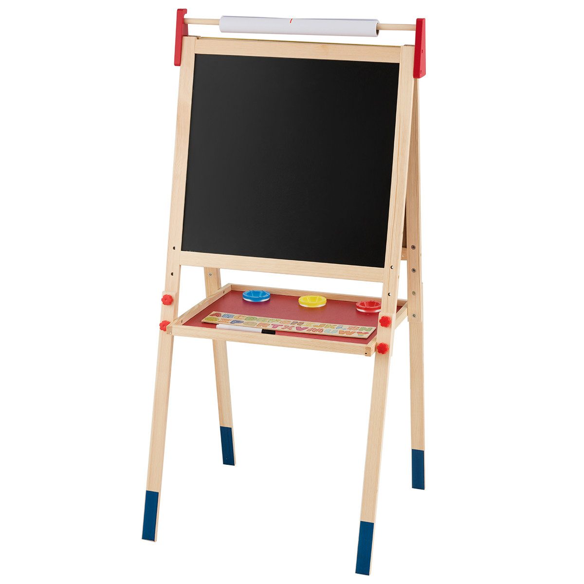 Lieferumfang | 1 x Standtafel 3 x Farbbecher 1 x Tafel-Marker 2 x Kreide 1 x Radiergummi 26 x Magnetische Aufkleber 1 x 5 m Zeichenpapier 1 x Bedienungsanleitung |