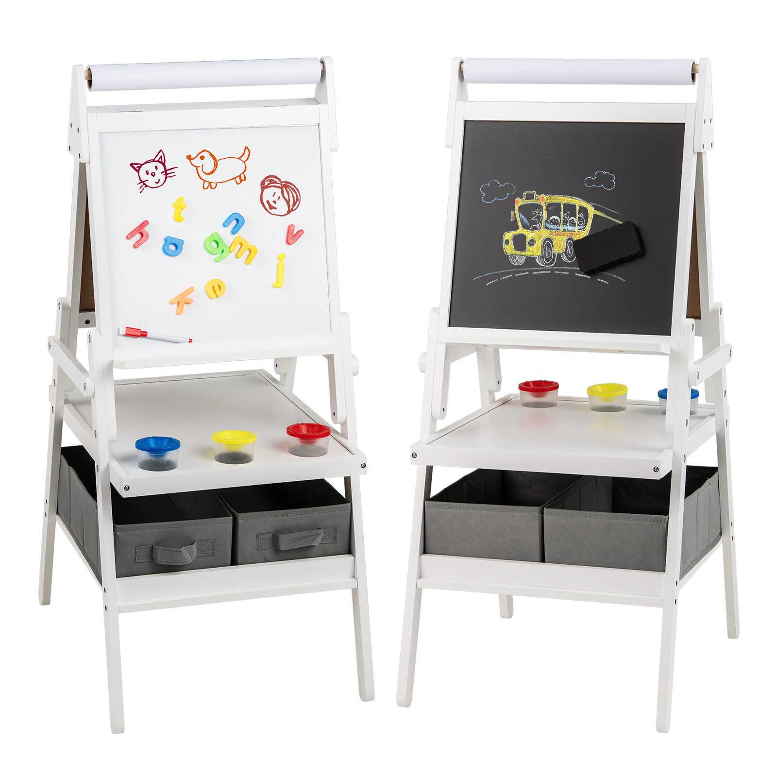 Die doppelseitige Staffelei ist ein perfektes Geschenk für 3-6-jährige Jungen und Mädchen, um ihre Zeichen- und Schreibfähigkeiten zu entwickeln. Sie verfügt über eine Tafel, ein Whiteboard und eine austauschbare Papierrolle, damit Kinder mit ihren Freunden malen können. Die magnetische Tafel und das Whiteboard erleichtern außerdem das Anbringen von Buchstaben, Zahlen und Formen für lehrreichen Spaß. Außerdem sorgt das große Tablett mit 3 Farbbechern dafür, dass die Pinsel ordentlich organisiert bleiben. 2 kleine Werkzeugtabletts und 2 Stoffbehälter bieten Platz für Kunstzubehör und Spielzeug. Der A-förmige Rahmen und die soliden Beine sorgen für Stabilität.