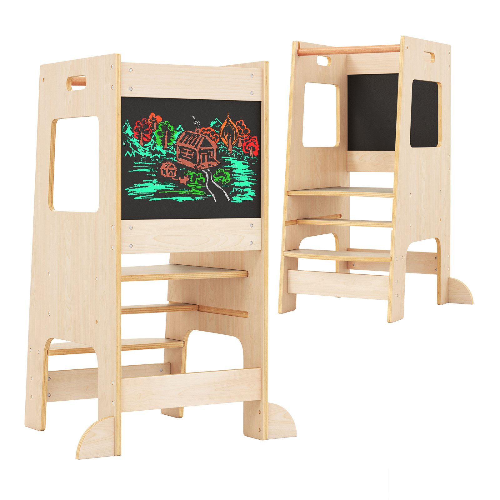 Die höhenverstellbare Plattform in 2 Stufen sorgt dafür, dass Ihr Kind sicher die Arbeitsplatte und das Waschbecken erreicht und sich bequem in verschiedene Aktivitäten einfügt. Die integrierten Tafeln fördern künstlerischen Ausdruck und Bildungsaktivitäten. Aus massivem Holz mit Sicherheitsmerkmalen, darunter ein Anti-Kipp-Geländer und abgerundete Kanten, eignet sich dieses Trittgestell für Kinder ab 3 Jahren und trägt bis zu 60 kg. Mehr als nur ein Trittwerkzeug, dient es auch als Aktivitätscenter, das Unabhängigkeit und Lernen in unterschiedlichen Umgebungen fördert.
