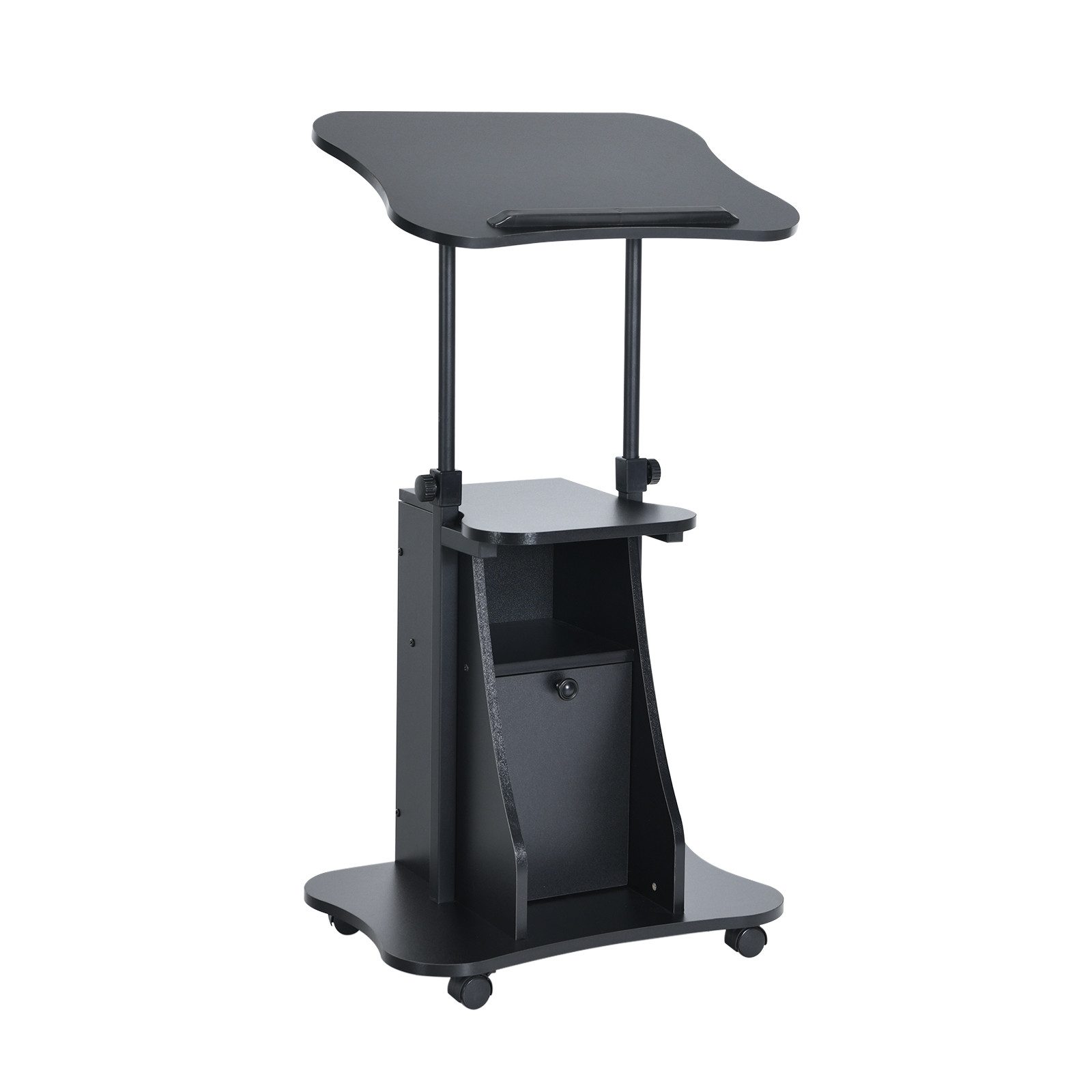 Dieser ergonomische, höhenverstellbare Computertisch ermöglicht den bequemen Wechsel zwischen Sitz- und Stehmodus, wodurch Rückenermüdung nach stundenlangem Arbeiten vermieden werden kann. Der Schreibtisch ist geräumig genug, um die notwendigen Büroutensilien unterzubringen, und es gibt auch einen Barrierestreifen, der verhindert, dass Gegenstände herunterfallen. Darüber hinaus können Sie einfach den Knopf drehen, um den Winkel der Tischplatte anzupassen. Dieser Sitz-Steh-Schreibtisch verfügt über ein offenes Regal und einen Aufbewahrungsschrank und bietet ausreichend Platz für eine Vielzahl von Gegenständen. Für große Mobilität und bequeme Nutzung sorgen die flexiblen Rollen, die das Bewegen des Büroschreibtisches von einem Ort zum anderen erleichtern. Ob im Büro oder zu Hause, unser Stehschreibtisch ist die ideale Wahl.