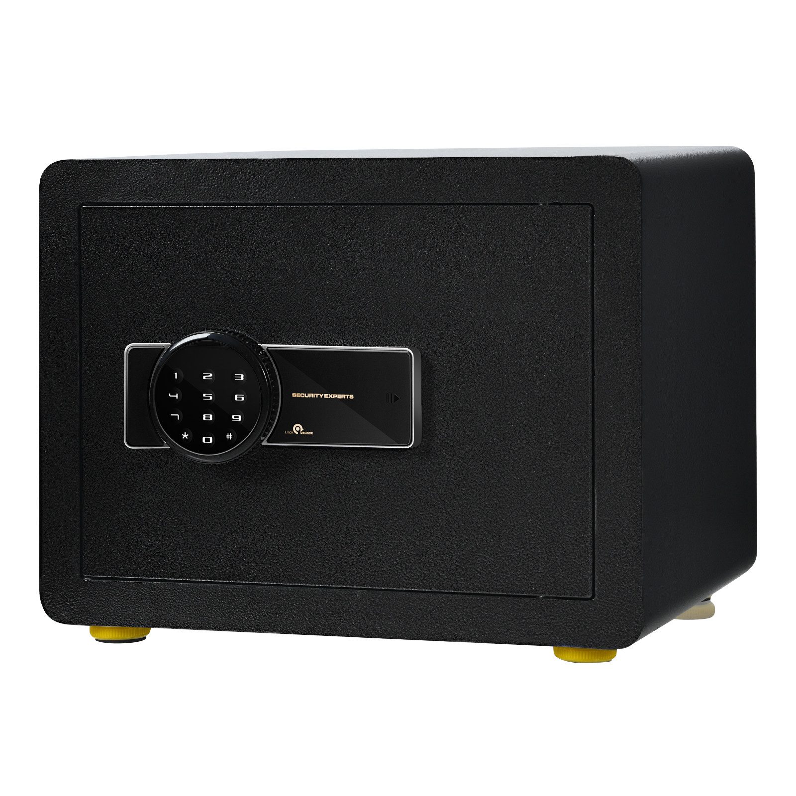 Mit unserem Safe sind Ihre Schmuckstücke, Dokumente, Pässe usw. geschützt. Er besteht aus hochwertigem Karbonstahl, der äußerst robust ist. Außerdem kann er durch die zwei vorgebohrten Löcher ganz einfach in der Wand montiert werden. Das Alarmsystem gewährleistet eine hervorragende Sicherheit. Der Safe funktioniert über einen Zahlencode, kann jedoch auch mit den mitgelieferten Notfallschlüsseln geöffnet werden.