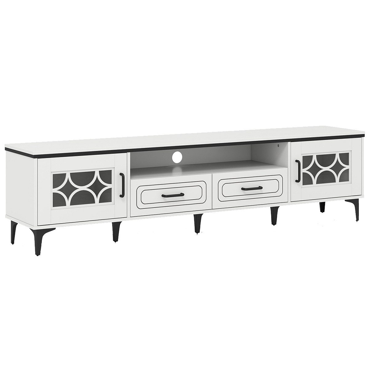 Erhöhen Sie Ihren Unterhaltungsraum mit diesem TV-Ständer, der für Flachbildfernseher bis zu 80" geeignet ist. Mit 2 ausziehbaren Schubladen und großen Schränken bietet dieser Medienkonsolentisch zahlreiche Aufbewahrungsmöglichkeiten für Ihre Unterhaltungsessentials. Die transparenten Türen mit Diamantmustern bieten eine ästhetische Darstellung des Inhalts im Inneren. Ein zusätzliches offenes Fach bietet Stauraum für Ihre DVD-Spieler, Fernbedienungen oder Spielkonsole.