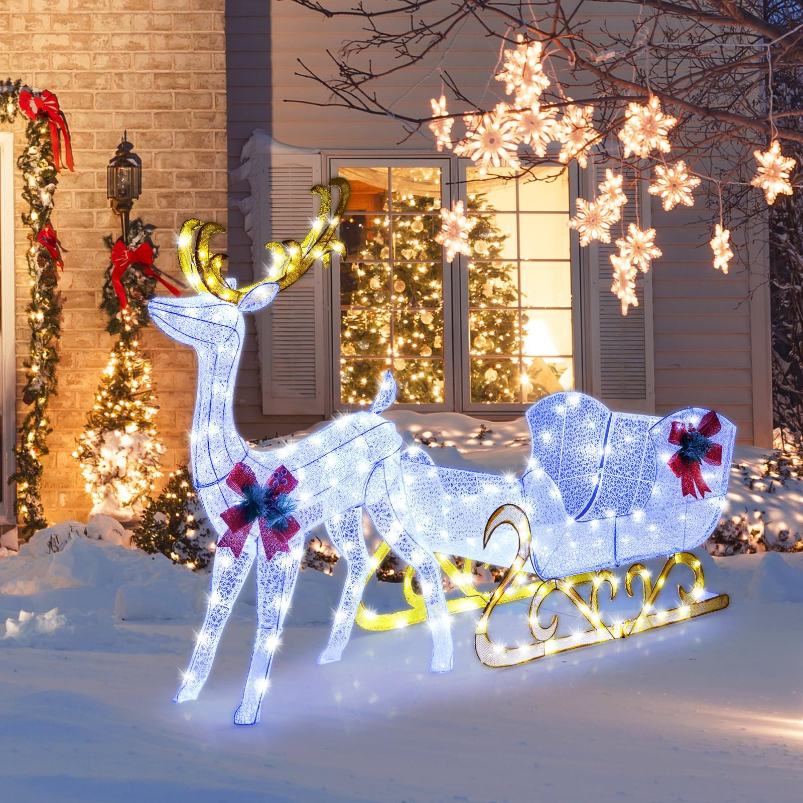Unser vorgefertigtes Rentier- und Santas Schlitten-Dekorationsset wird eine großartige Ergänzung für Ihren Hinterhof oder Ihre Veranda zu Weihnachten sein. Das Bild des Rentiers, das den Schlitten zieht, verstärkt die Weihnachtsatmosphäre in der Umgebung. Und 215 LED-Lichter machen es bei Dunkelheit attraktiver. Sie können es je nach Bedarf drinnen oder draußen platzieren. Der stabile Metallrahmen und das wasserfeste Lametta ermöglichen den Einsatz des Dekorationssets bei hoher Stabilität und Haltbarkeit im Freien. Und die Oberfläche ist kühl zu berühren, ohne Sie zu verbrennen. Es wird sehr erfreulich sein, das kommende Weihnachten mit unserem Rentier & Schlitten Dekorationsset zu verbringen.