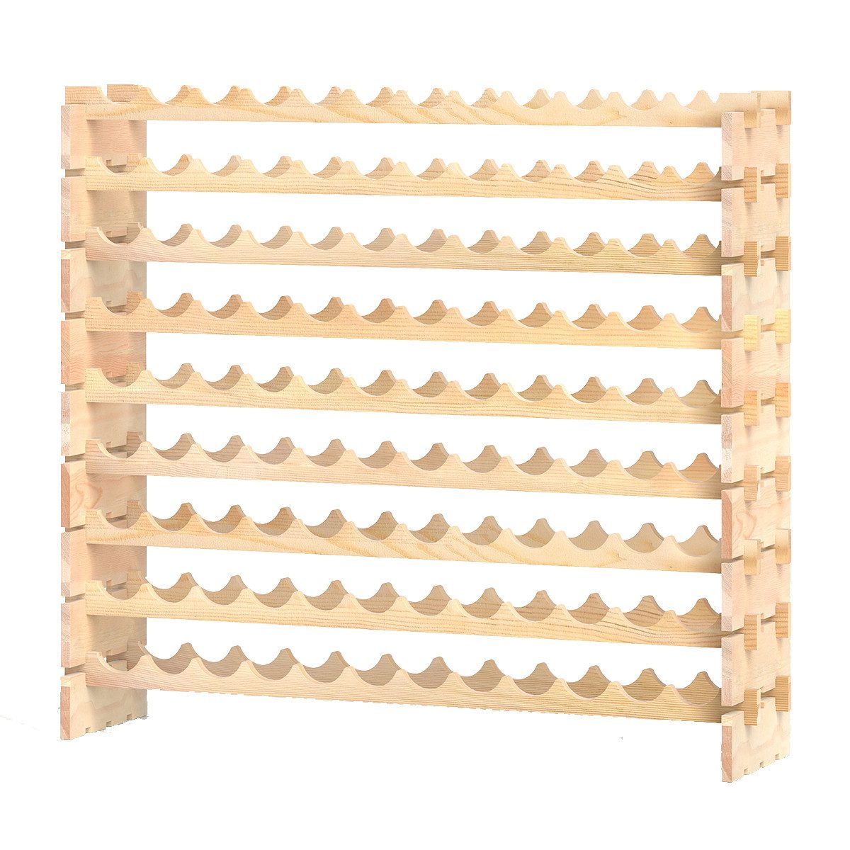 Gefertigt aus natürlichem Kiefernholz, bietet dieses freistehende Weinlagerregal eine Tragfähigkeit von 160 kg und kann bis zu 108 Flaschen verschiedener Typen aufnehmen. Die Wellen-Slots halten jede Flasche sicher, während der leichte Neigungswinkel für optimale Frische sorgt. Darüber hinaus lässt sich dieser Weinflaschenhalter einfach individuell gestalten und kann ohne Werkzeuge mühelos montiert werden. Ob im Esszimmer, in der Bar oder im Keller ausgestellt, dieses Weinflaschen-Regal bietet eine stilvolle und praktische Aufbewahrungslösung für Weinliebhaber und Sammler gleichermaßen.