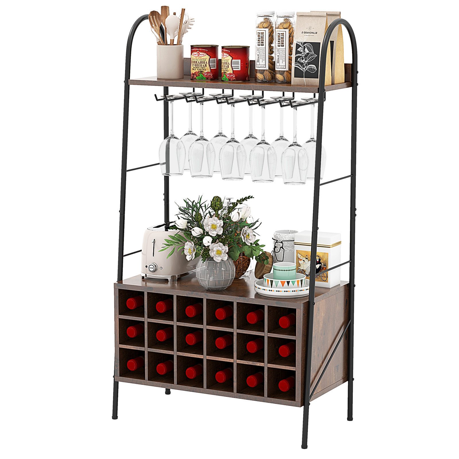 Suchen Sie ein Weinregal zur Aufbewahrung Ihrer Weinsammlung? Unser Weinregal mit großer Kapazität ist die ideale Wahl. Es bietet Platz für bis zu 15 Gläser und 18 Flaschen Wein. Darüber hinaus stellen die breite Arbeitsplatte und die obere Ablage zusätzlichen Stauraum für Kleingeräte oder Dekorationen zur Verfügung. Sein robuster Metallrahmen, der Kippschutz und die verstellbare Fußpolster garantieren allgemeine Stabilität und Sicherheit. Die angemessene Höhe von 114,5 cm ermöglicht einen bequemen Zugang. Sie können es in der Küche, im Esszimmer, im Wohnzimmer, in der Bar usw. verwenden.