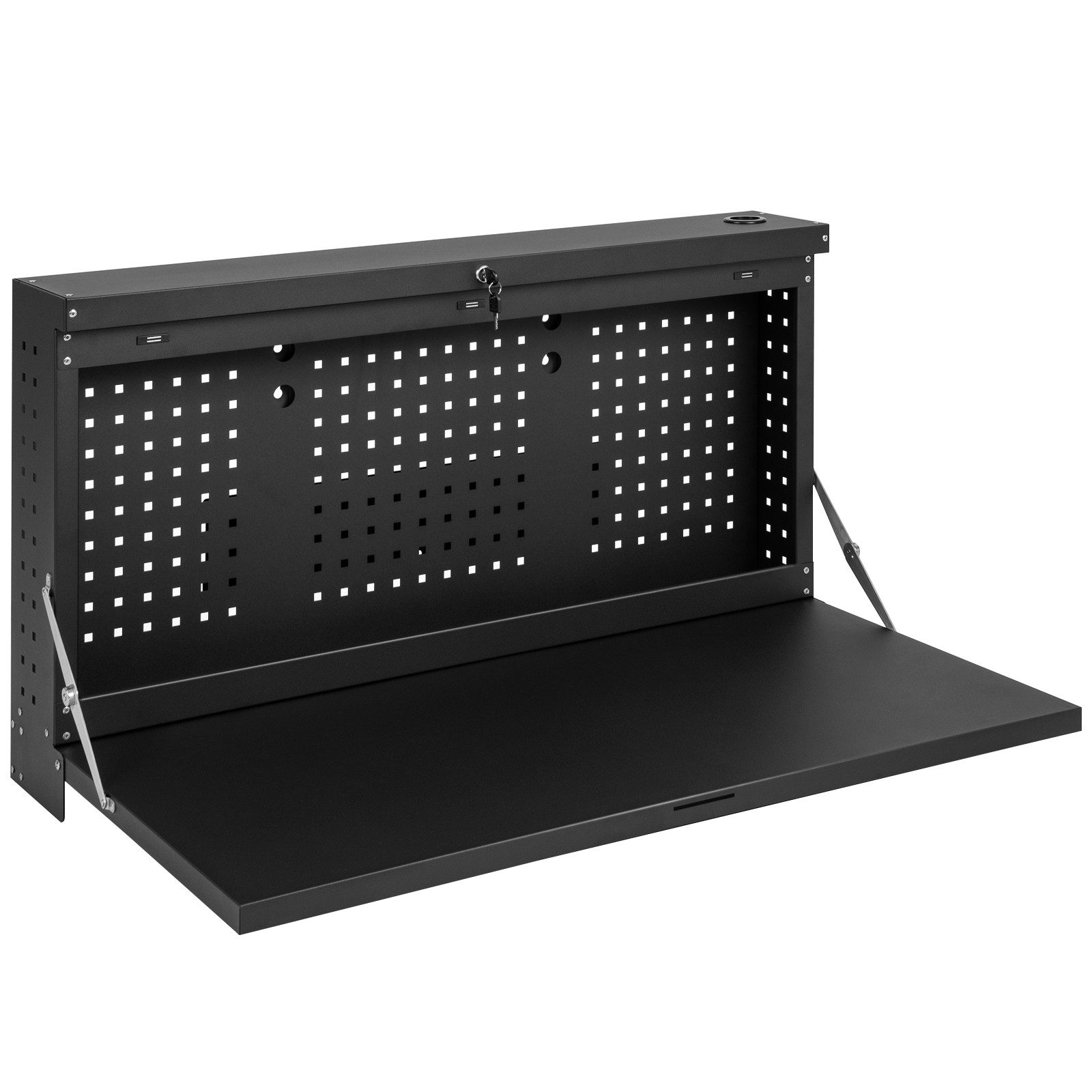 Organisieren Sie Ihre Garage mit unserer klappbaren hängenden Werkbank! Unsere klappbare wandmontierte Werkbank kombiniert eine Lochwand und eine Werkbank in einem cleveren Design, das es Ihnen ermöglicht, Werkzeuge zu lagern und gleichzeitig zu arbeiten. Die unzähligen Löcher auf unserer Lochwand bieten ausreichend Stauraum für Ihre Werkzeuge, damit Sie die benötigten Werkzeuge bequem in Reichweite haben. Nach Abschluss der Reparaturen können Sie die Werkbank leicht zusammenklappen, um mehr Platz zu sparen. Und Sie können den Tisch mit einem Schlüssel verriegeln, um zu verhindern, dass der Tisch aufgrund von Kollisionen nach unten klappt. Darüber hinaus besteht unsere klappbare wandmontierte Werkbank aus kratzfestem und stabilem kaltgewalztem Blech, das langlebig ist und 50 kg tragen kann. Außerdem ist der wandmontierte Werkzeugorganizer einfach zu installieren und zu reinigen.