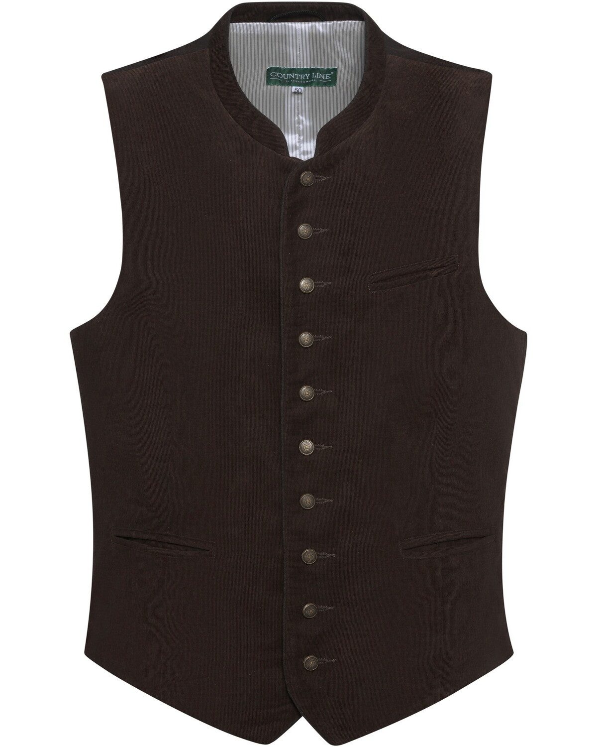 Die Herren Trachtenweste von Country Line überzeugt durch ihre hochwertige Verarbeitung und stilvolles Design. Die Front sowie das seitliche Rückteil sind aus feinem Baumwollcord gefertigt, was nicht nur für eine angenehme Haptik sorgt, sondern auch eine edle Optik bietet. Die Kontrastpaspel am Stehkragen und an der vorderen Kante setzt markante Akzente und verleiht der Weste eine moderne Note. Praktische Details machen diese Trachtenweste zu einem vielseitigen Begleiter für verschiedene Anlässe. Mit drei Paspeltaschen und einer Innentasche bietet sie ausreichend Stauraum für persönliche Gegenstände. Die Knopfleiste in der vorderen Mitte rundet das Design ab und sorgt für eine einfache Handhabung, während die sorgfältige Verarbeitung der Nähte die Langlebigkeit des Kleidungsstücks garantiert. Ein weiteres Highlight ist der Rücken, der mit einem weitenverstellbaren Riegel ausgestattet ist. Dieser ermöglicht eine individuelle Anpassung und sorgt für einen optimalen Sitz. Ob bei festlichen Anlässen oder geselligen Treffen, die Herren Trachtenweste von Country Line kombiniert traditionelles Flair mit modernem Komfort und ist somit eine stilvolle Wahl für jeden modebewussten Herren. Oberstoff: 100% Baumwolle; Futter: 66% Acetat, 34% Polyester
