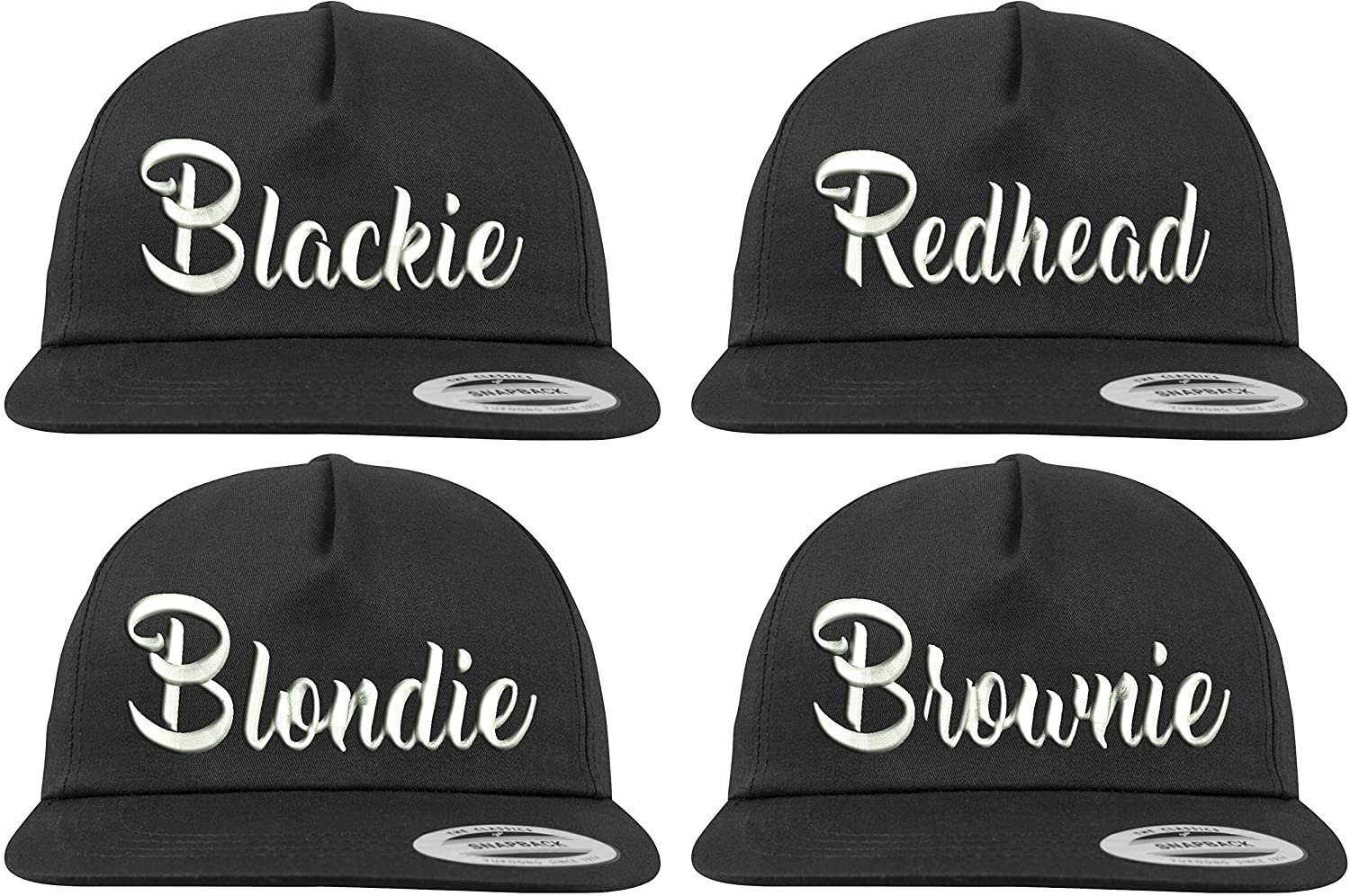 Blondie Brownie Blackie Redhead Partner Look Cap Set mit modischem Logo Print als Stickapplikation für Beste Freunde und Pärchen.