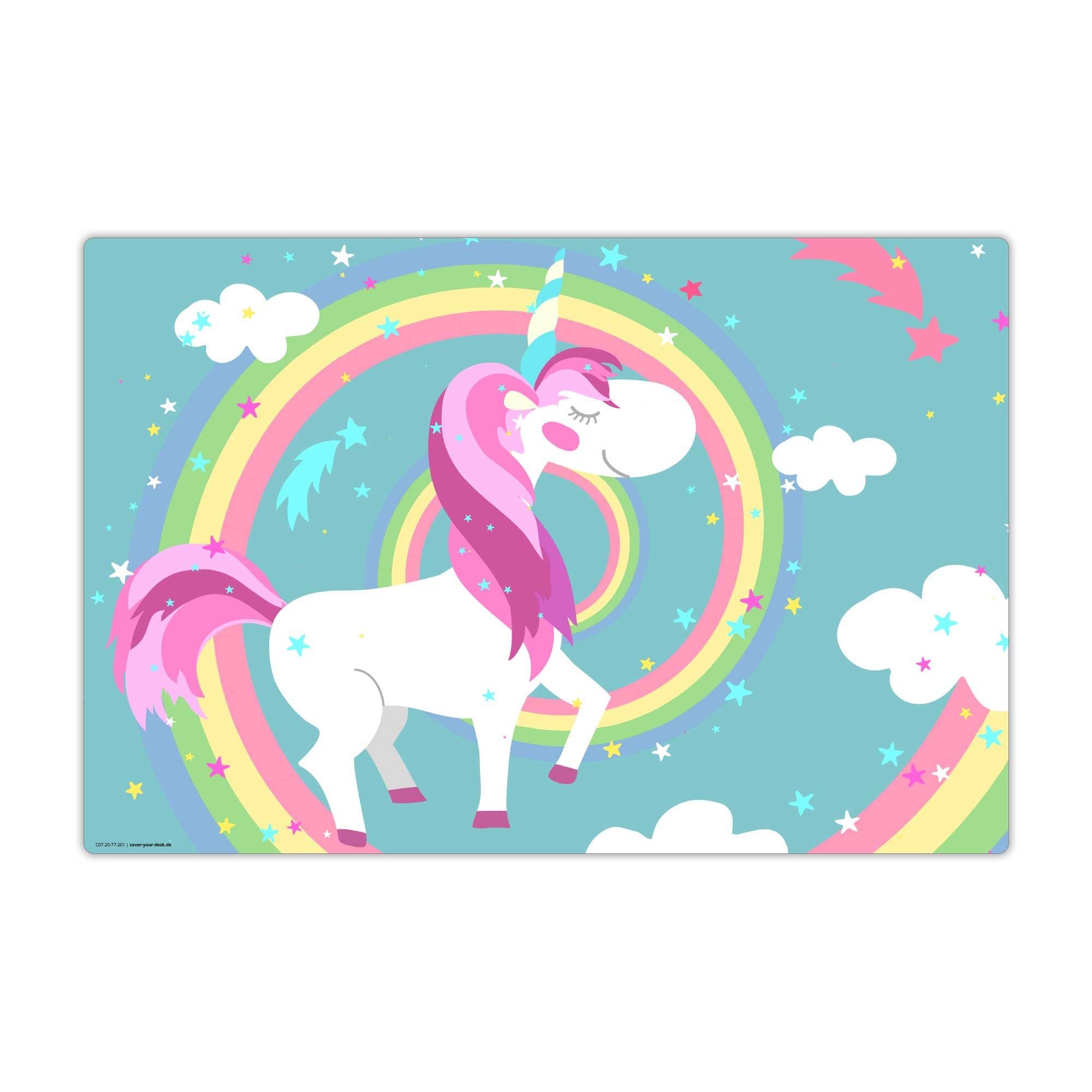 Schöne Schreibtischunterlage für Kinder mit einem Einhorn und Regenbogen.