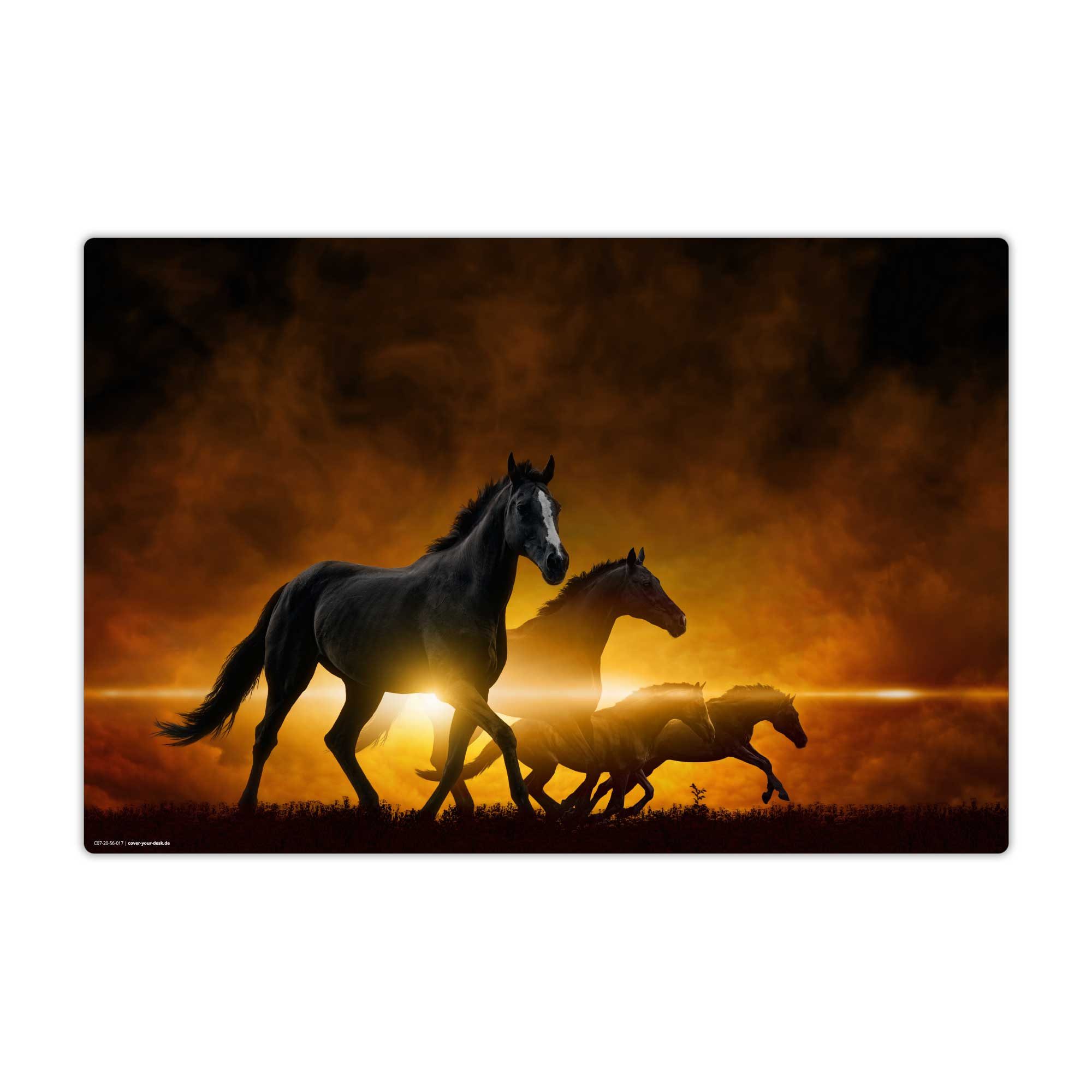Schwarze Pferde bei Sonnenaufgang - eine wunderschöne Schreibtischunterlage für alle Pferdeliebhaber!