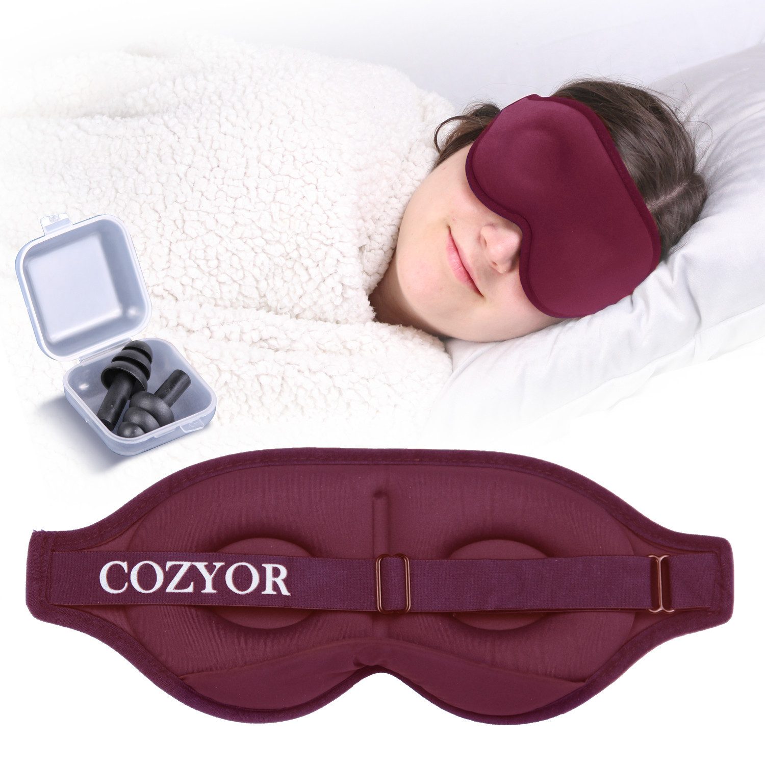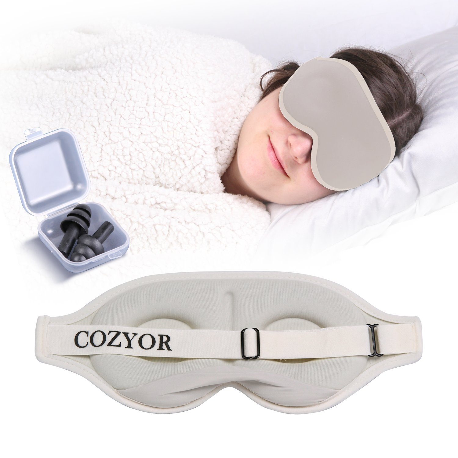 Das ergonomische Design unserer COZYOR Augenmaske bietet Dir eine maximale Lichtabdichtung, ohne dabei unangenehmen Druck auf Deine Augen- oder Nasenpartie auszuüben. Durch die extra Polsterung und variable Passform ist unsere Schlafmaske nicht nur weich und bequem, sondern auch atmungsaktiv und leicht kühlend. Damit Du einen besonders tiefen und ungestörten Schlaf genießen kannst, bekommst Du von uns ein Paar Komfort-Ohrstöpsel umsonst zu Deiner Bestellung dazu!