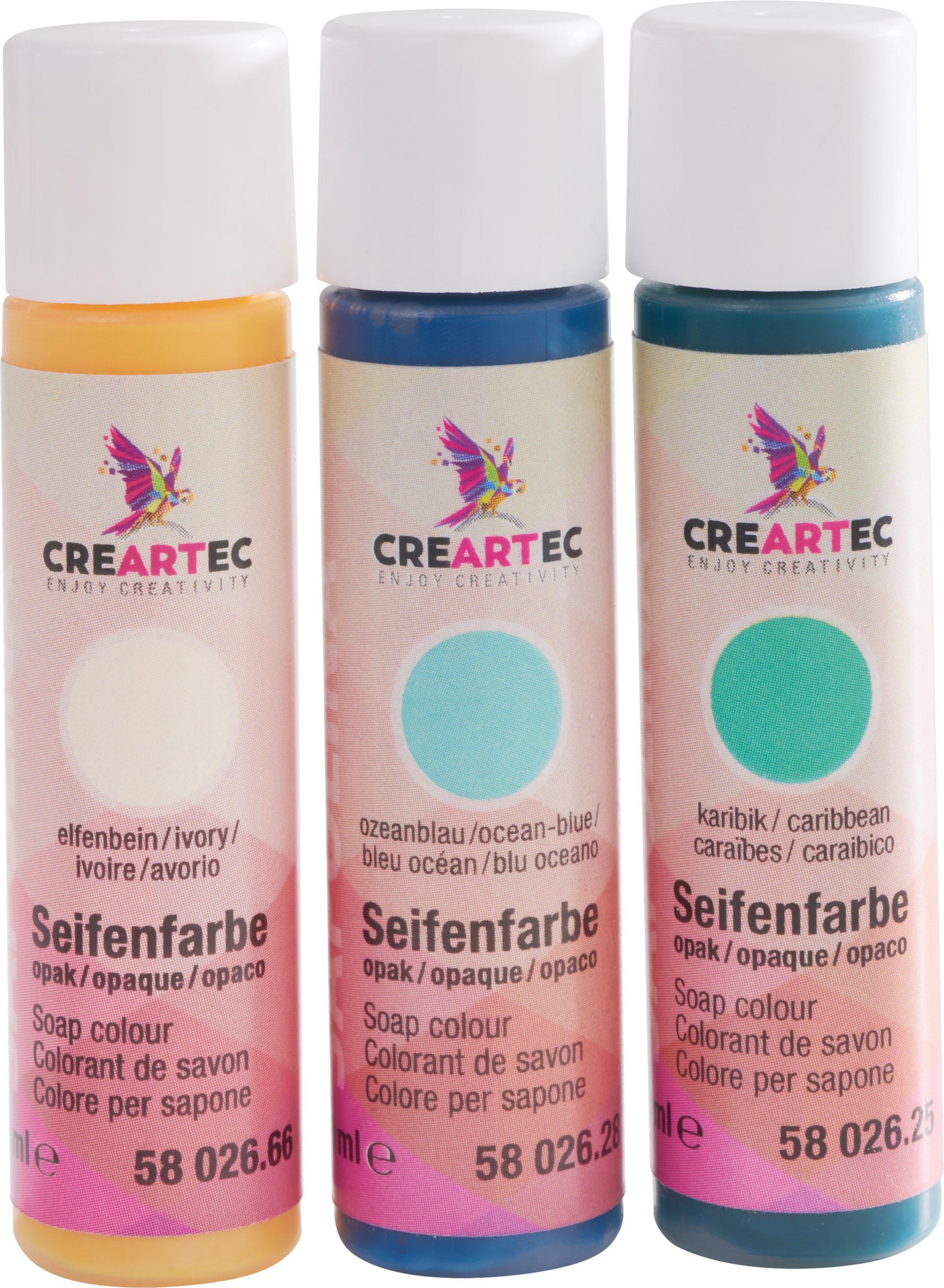 Seifenfarben Set 'Ozean' mit den 3 Farben Elfenbein, Karibik und Ozeanblau. Jedes Fläschchen hat einen Inhalt von 10 ml und lässt sich leicht dosieren. Je mehr Tropfen hinzugefügt werden, desto intensiver wird das Farbergebnis. Die Seifenkreationen lassen sich zusätzlich mit Seifenduft und getrockneten Blüten ergänzen. Verpackt mit Schleifenband, Stickern und Anhängern werden tolle Geschenke daraus.