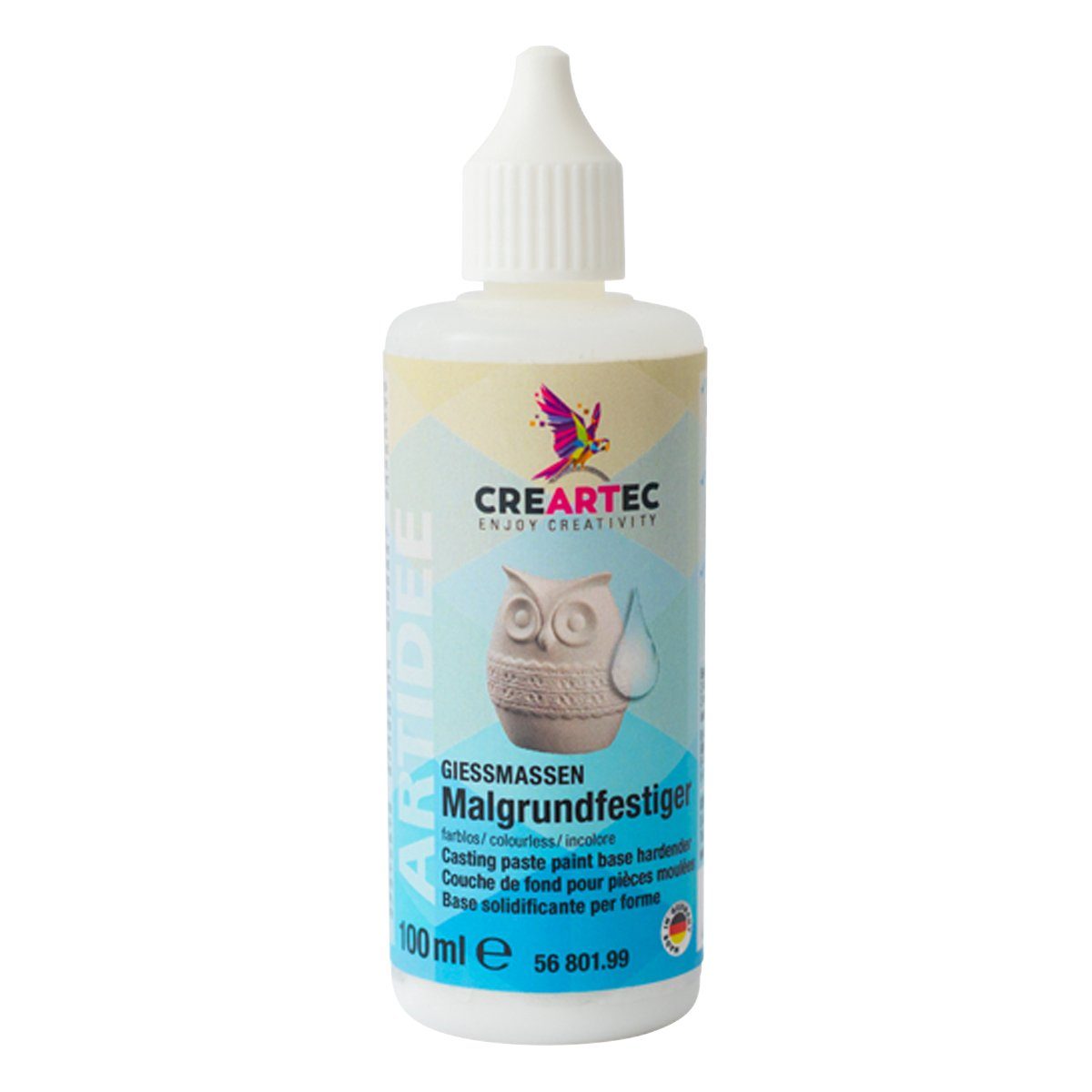 Der farblose Gießmassen Malgrundfestiger auf Wasserbasis ist eine transparente Grundierung, die die Poren Ihrer Gießlinge verschließt. Sie kann auf Untergründen wie zum Beispiel Stein, Gips, Beton, keramischen Gießmassen, Poroton oder Rohkeramik angewendet werden. Der Malgrund sollte einmalig gleichmäßig dünn mit einem Pinsel aufgetragen werden. Dadurch verhindern Sie das Einsickern von Farben oder Glasuren die Sie hinterher auf Ihren selbstgefertigten Werkstücken anwenden möchten.