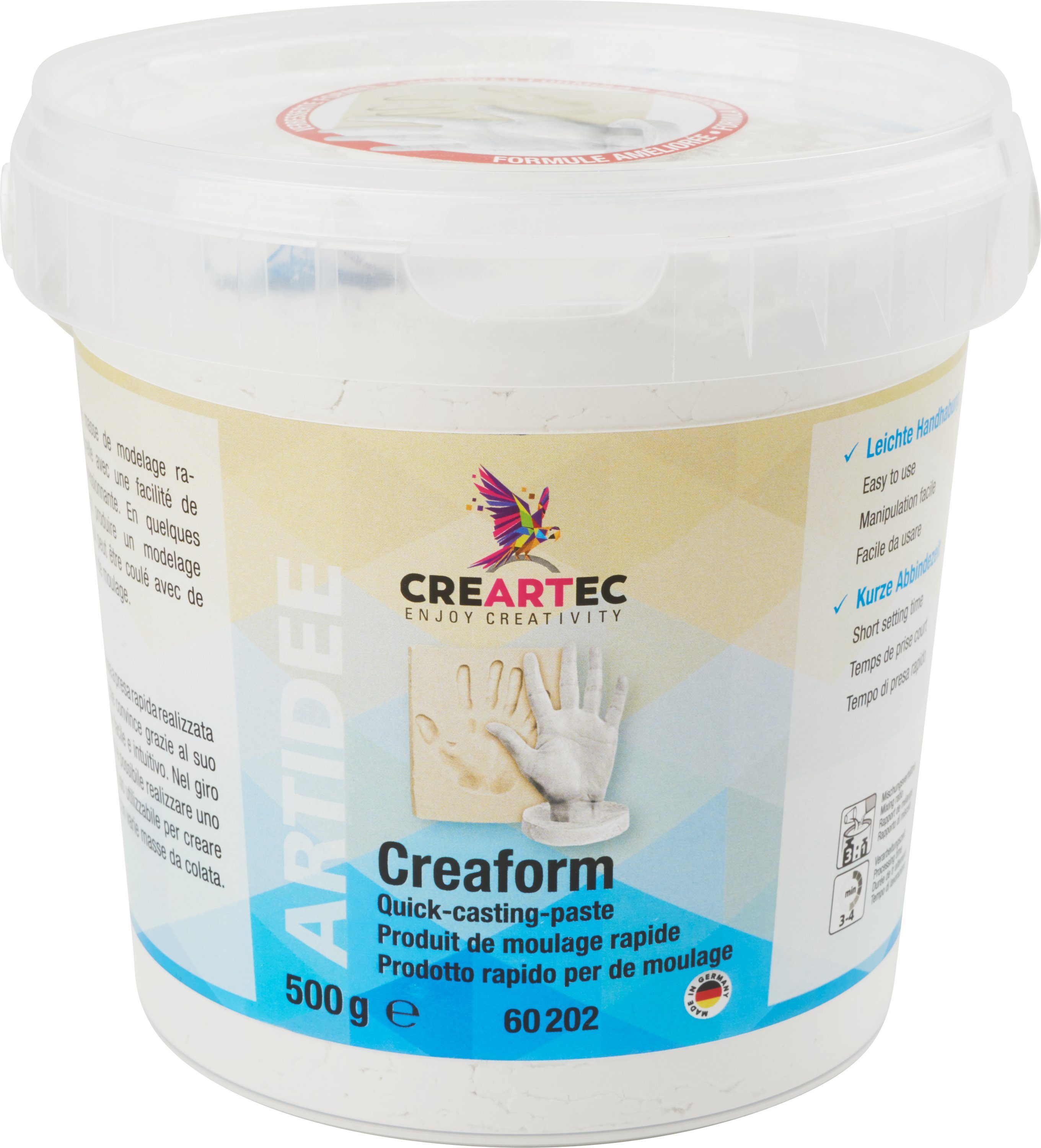 Zur problemlosen und schnellen Herstellung von Negativformen. Das Material besteht aus natürlichen Rohstoffen, ist ungiftig und hautfreundlich. Somit können auch Körperabformungen gemacht werden. Nach 5-10 Minuten ist die Form fertig und kann sofort ausgegossen werden. Mit detaillierter Anleitung. Das Mischungsverhältnis beträgt 3 Teile Wasser und 1 Teil Pulver.