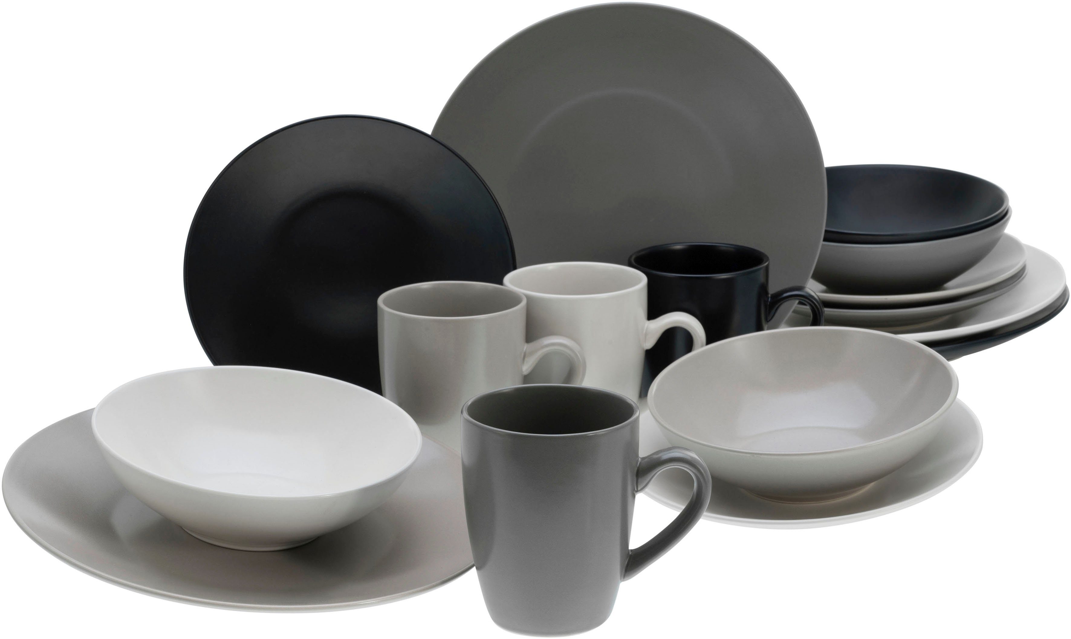 Das Set präsentiert sich in einer modernen Coupeform aus hochwertigem Steinzeug. Aktuell im Trend sind vor allem auch die 4 attraktiven Mattglasuren in den Farben Schwarz, Grau, Taupe und Creme. Elegant, modern, „Manhattan“: Ready for Daily Use!“