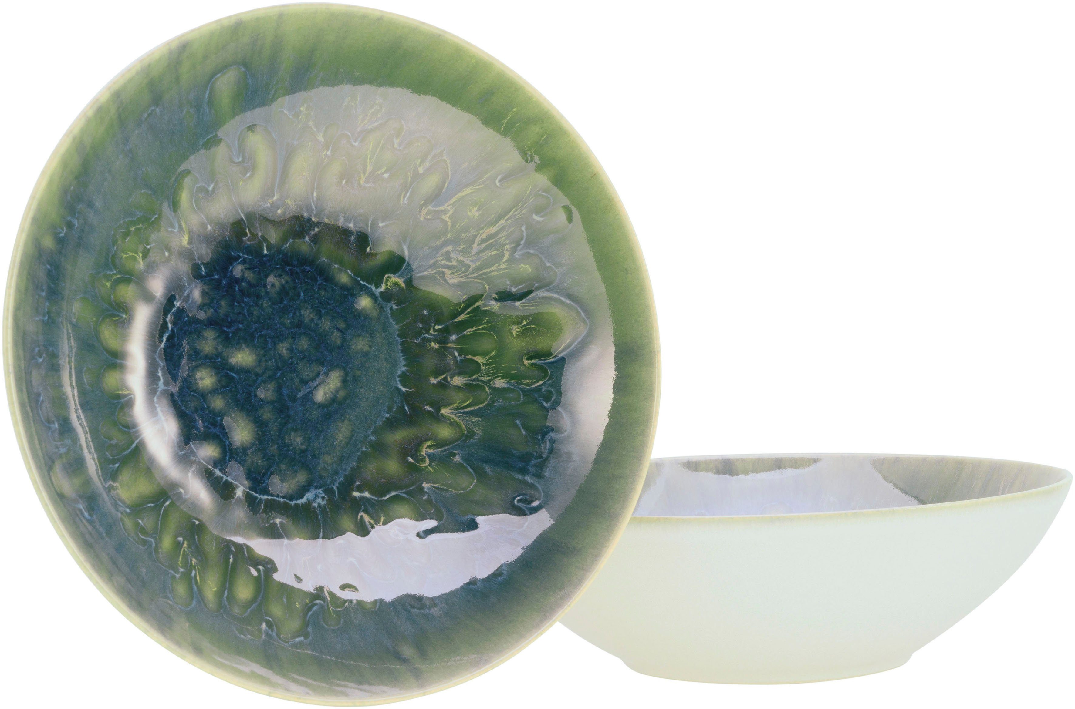 Schattierungen von Grün, Gelb und Blau, außen jeweils seidenmatt Weiß