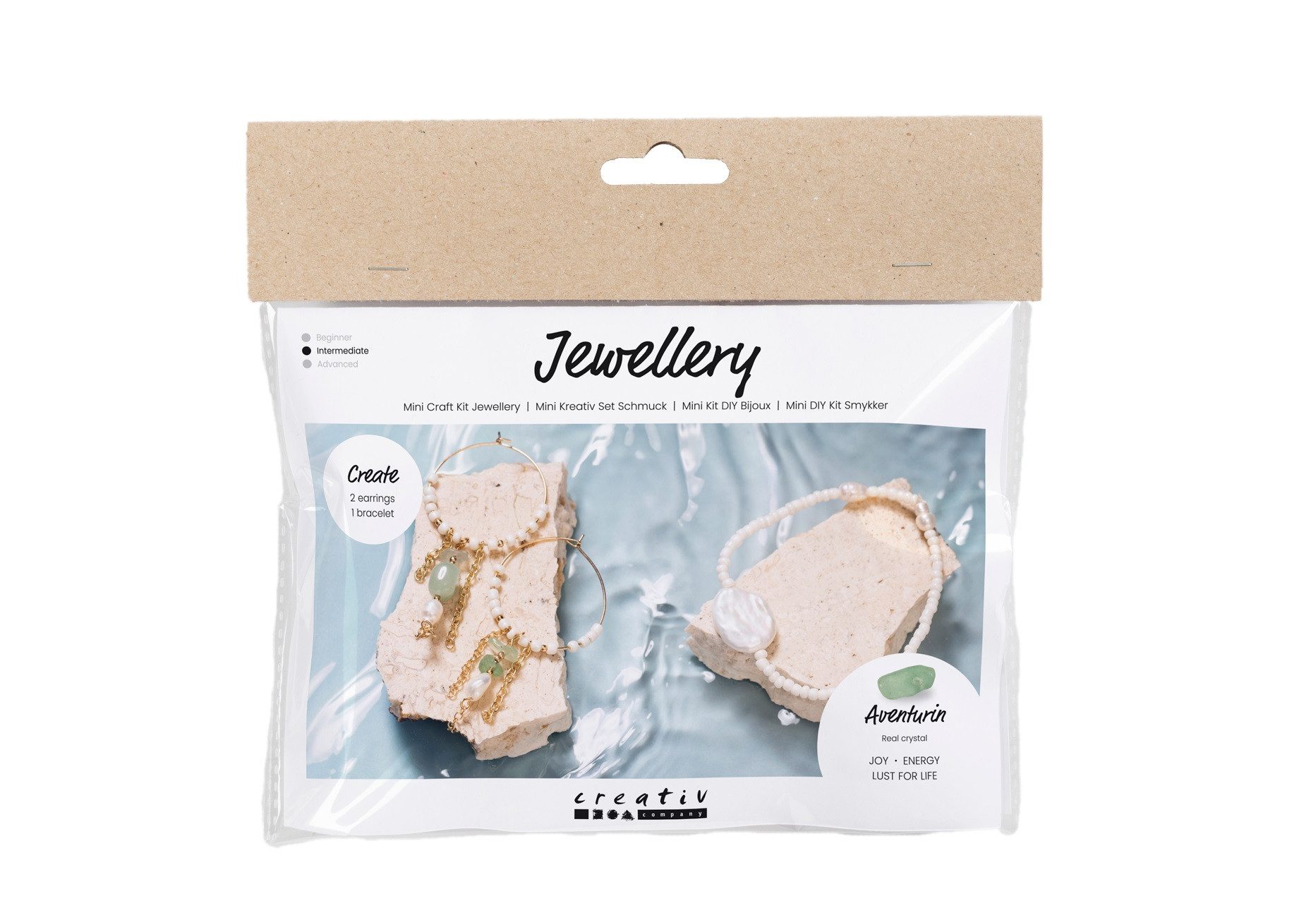 Inhalt: Aventurin-Quarz, Süßwasserperlen, Rocaille Seed Beads, Kettelstift, Quetschperlen, Gummiband, Perlennadel, Creolen, Kette.