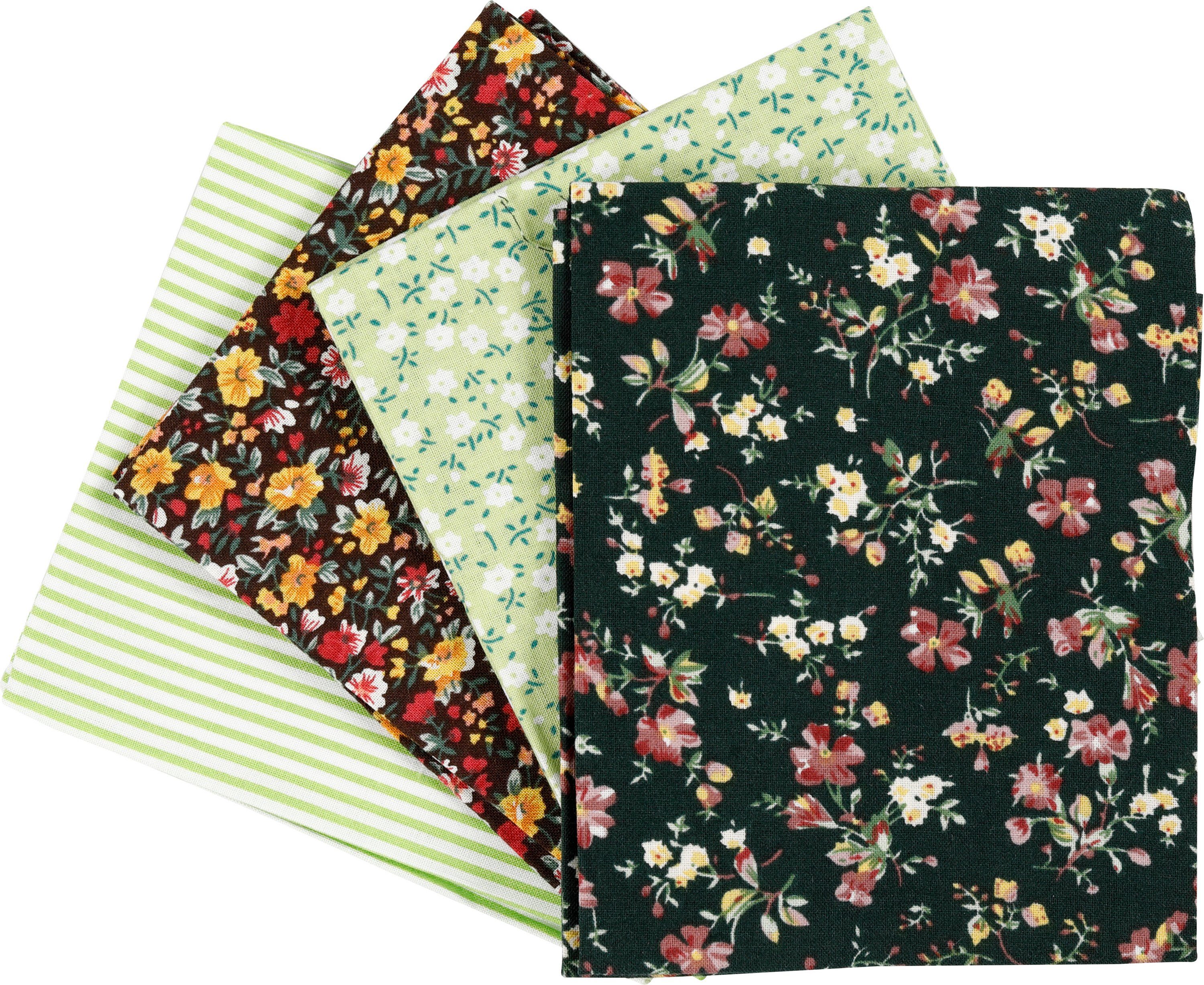 Stoffpaket 'Amazing Green', 4er-Set mit 4 Designs. Die Zuschnitte haben eine Размер von ca. 45 x 55 cm und ein Stoffgewicht von ca. 100 g/m². Das Material ist 100 % Baumwolle, waschbar bei 40 °C Feinwäsche. Hierbei ist ein Einlaufen von ca. 3 – 5 % möglich. Daher bietet es sich an, den Stoff vor der Verarbeitung zu waschen. Die Stoffe sind farblich perfekt aufeinander abgestimmt und im Grundton Grün. Toll für Ihre neuen Näh- und Patchwork-Projekte.