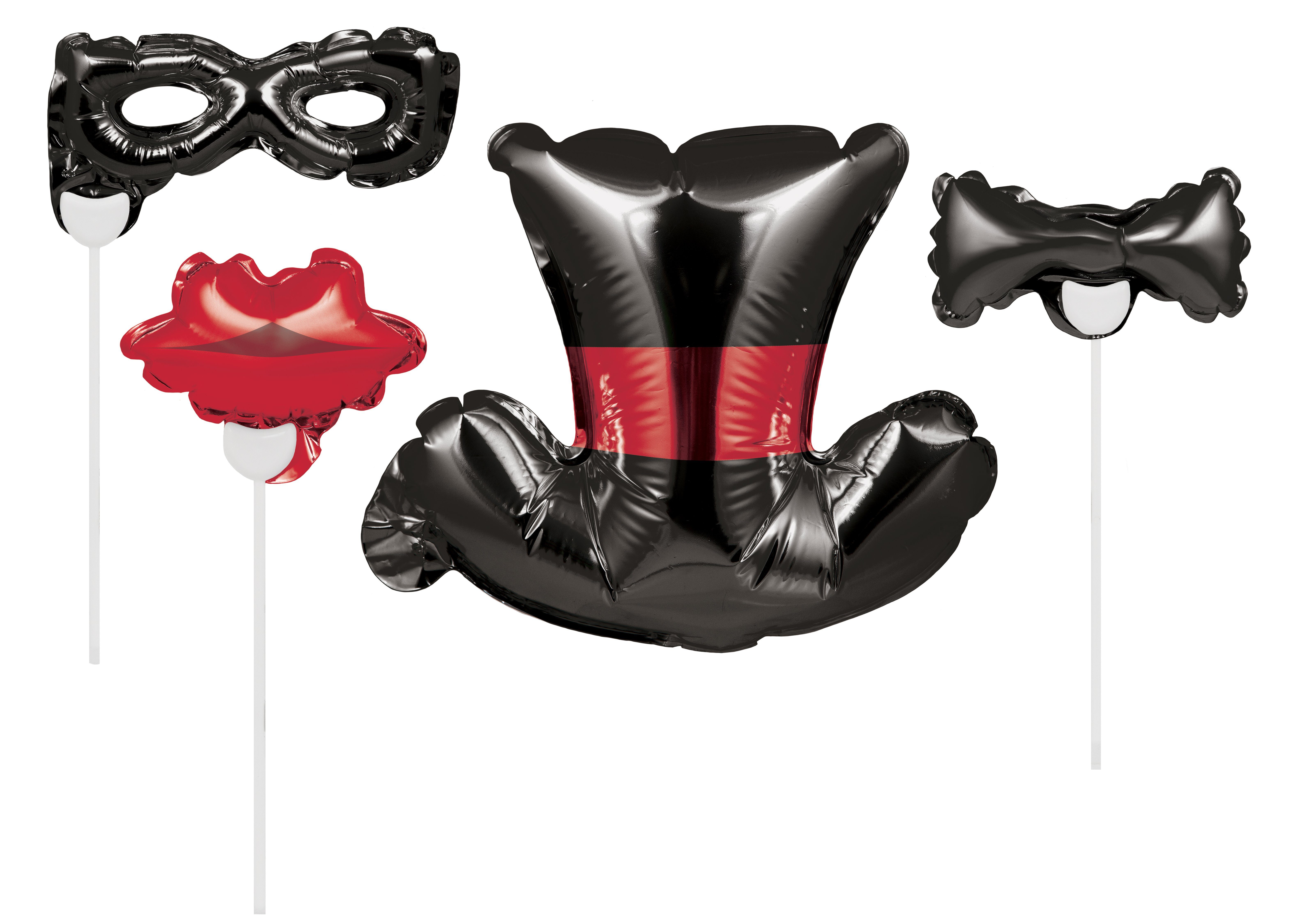 Super cooles Foto-Booth Set Zylinder für lustige Erinnerungsfotos auf einer Party, einer Hochzeit oder Karneval. Die Foto Requisiten sind nicht einfach nur zweidimensional aus Papier, sondern aus Folie und lassen sich mithilfe eines Röhrchens aufpusten. Das verleiht den Acceesoires einen tollen 3-D-Effekt, der die Fotos nochmals besser zur Geltung kommen lässt. Das Foto-Booth-Set Zylinder ist vierteilig und beinhaltet einen Zylinder, eine Fliege, rote Lippen als Kußmund sowie eine mystische Augenmaske.
