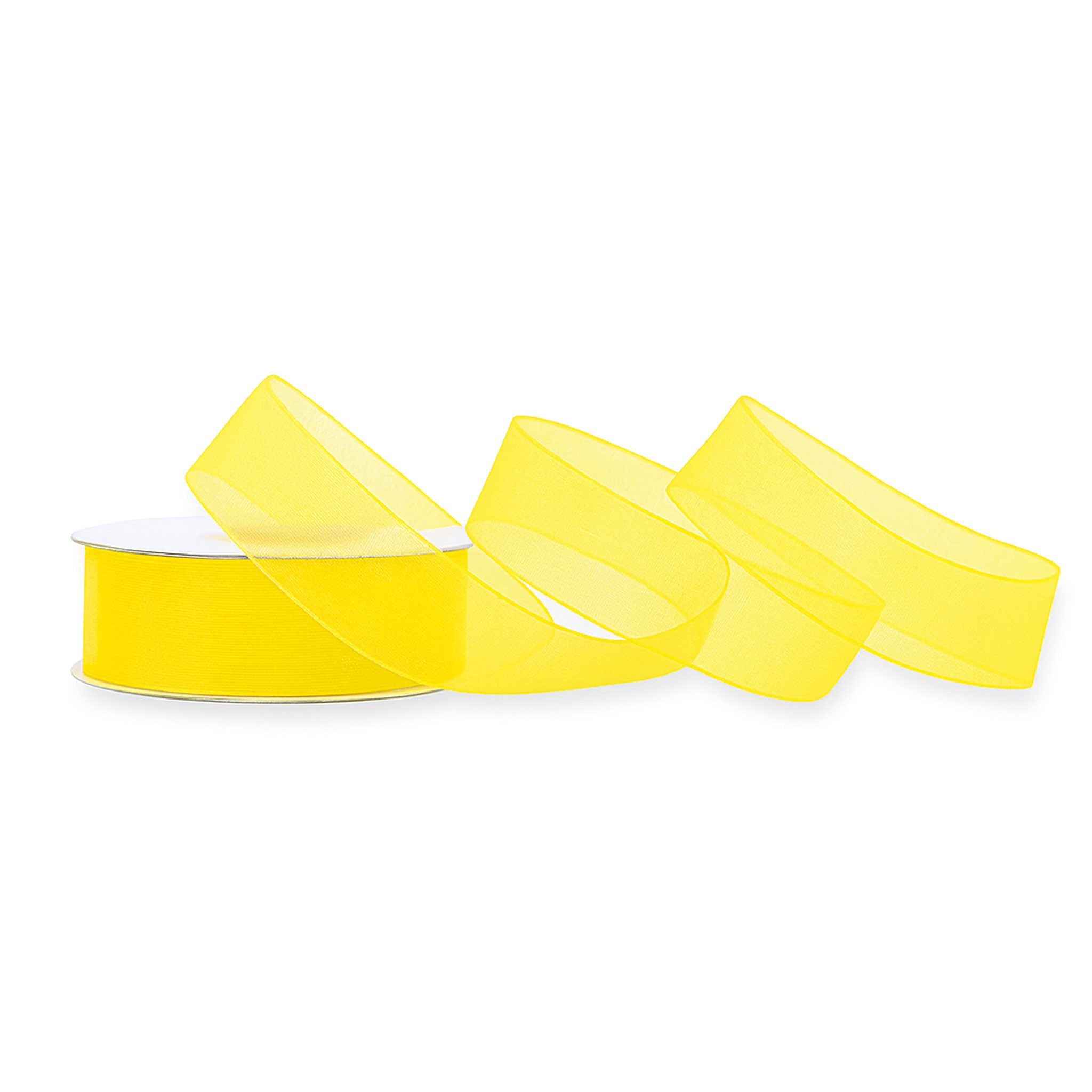 PRODUKT: Organzaband 25mm x 25m auf Rolle / MATERIAL: 100% Nylon / FARBTON: gelb / PFLEGE: waschbar bei 30 Grad, bügelfähig auf Stufe II, nicht bleichen