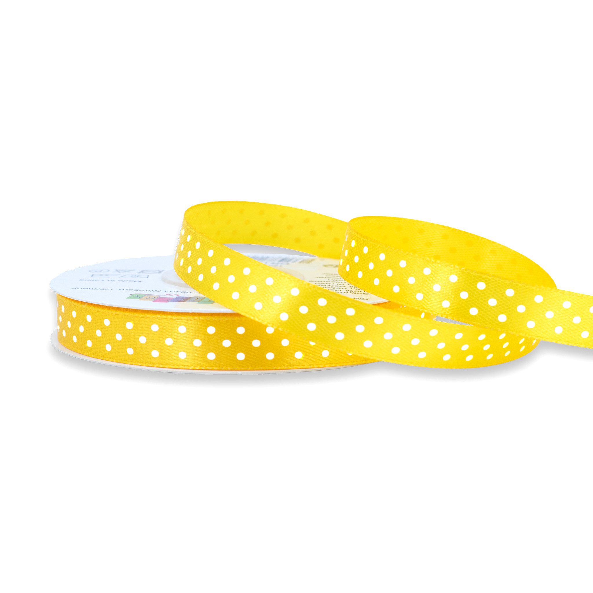 PRODUKT: Satinband gepunktet 12mm x 25m auf Rolle / MATERIAL: 100% Polyester / FARBTON: gelb - weiß / PFLEGE: waschbar bei 40 Grad, bügelbar auf Stufe II, nicht bleichen