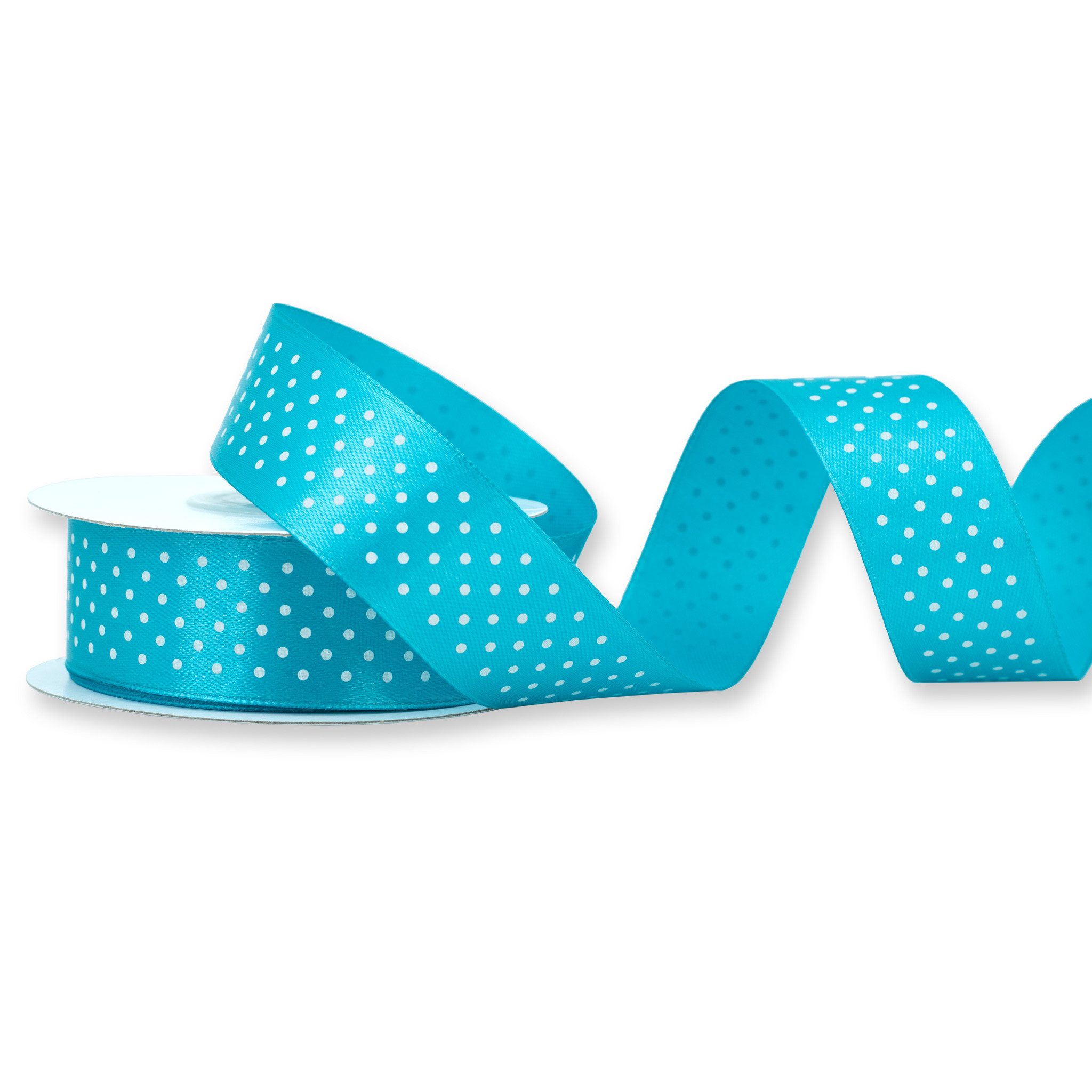 PRODUKT: Satinband gepunktet 25mm x 25m auf Rolle / MATERIAL: 100% Polyester / FARBTON: türkis - türkisblau - aquamarin - azurblau - weiß / PFLEGE: waschbar bei 40 Grad, bügelbar