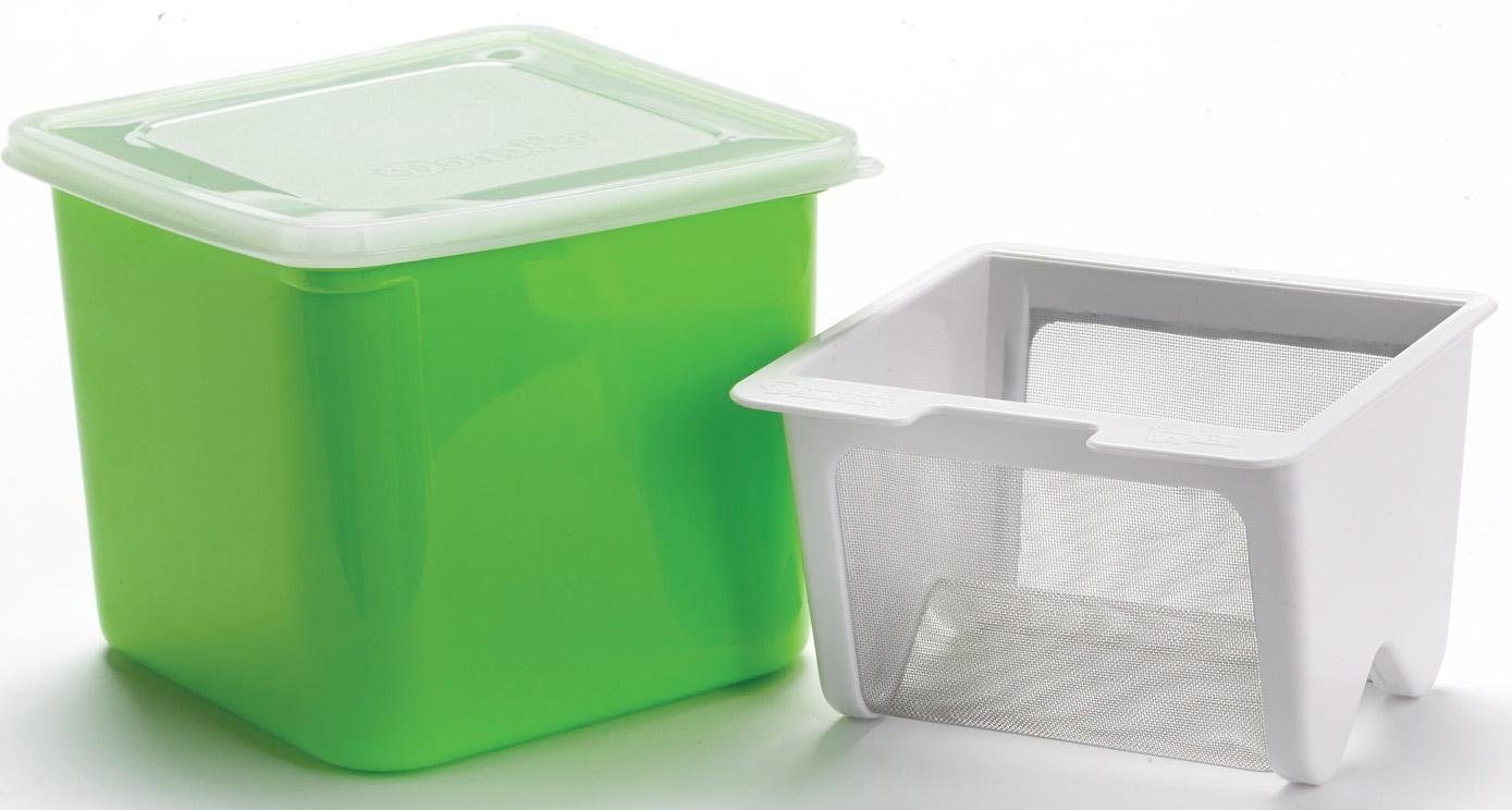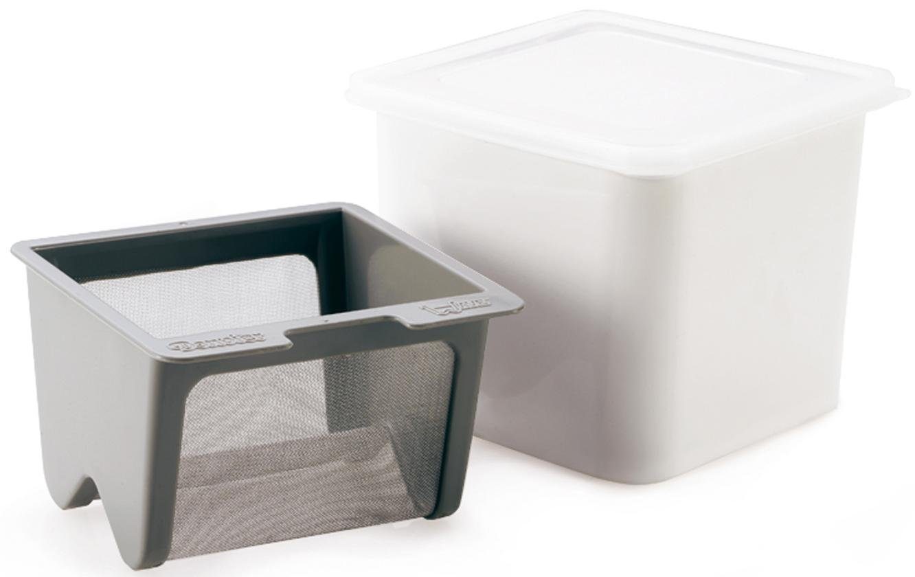 Mit diesem pfiffigen Küchenaccessoire macht sich leckerster Frischkäse, frei von ungewollten Zusatzstoffen quasi von allein. Beispiel: 800g Griechischen Joghurt (10%) mit etwas Pfeffer4, Salz und gehackten Kräutern vermengt und in den Siebeinsatz gefüllt. 2...3 Tage im Kühlschrank und fertig ist der mittelfeste Frischkäde und die im Becher gesammelte Molke ein leckeres, gesundes Getränk dazu. Man braucht weder Sieb, Seihtuch, Schüssel... Dieses Gerät ist platzsparend, hygienisch... und mittlerweile einfach unverzichtbar. Konsequenz: Ich gehe längst achtlos am Regal mit den X Sorten Frischkäse vorüber... keiner(!) ist so gut, wie der selbst gemachte...