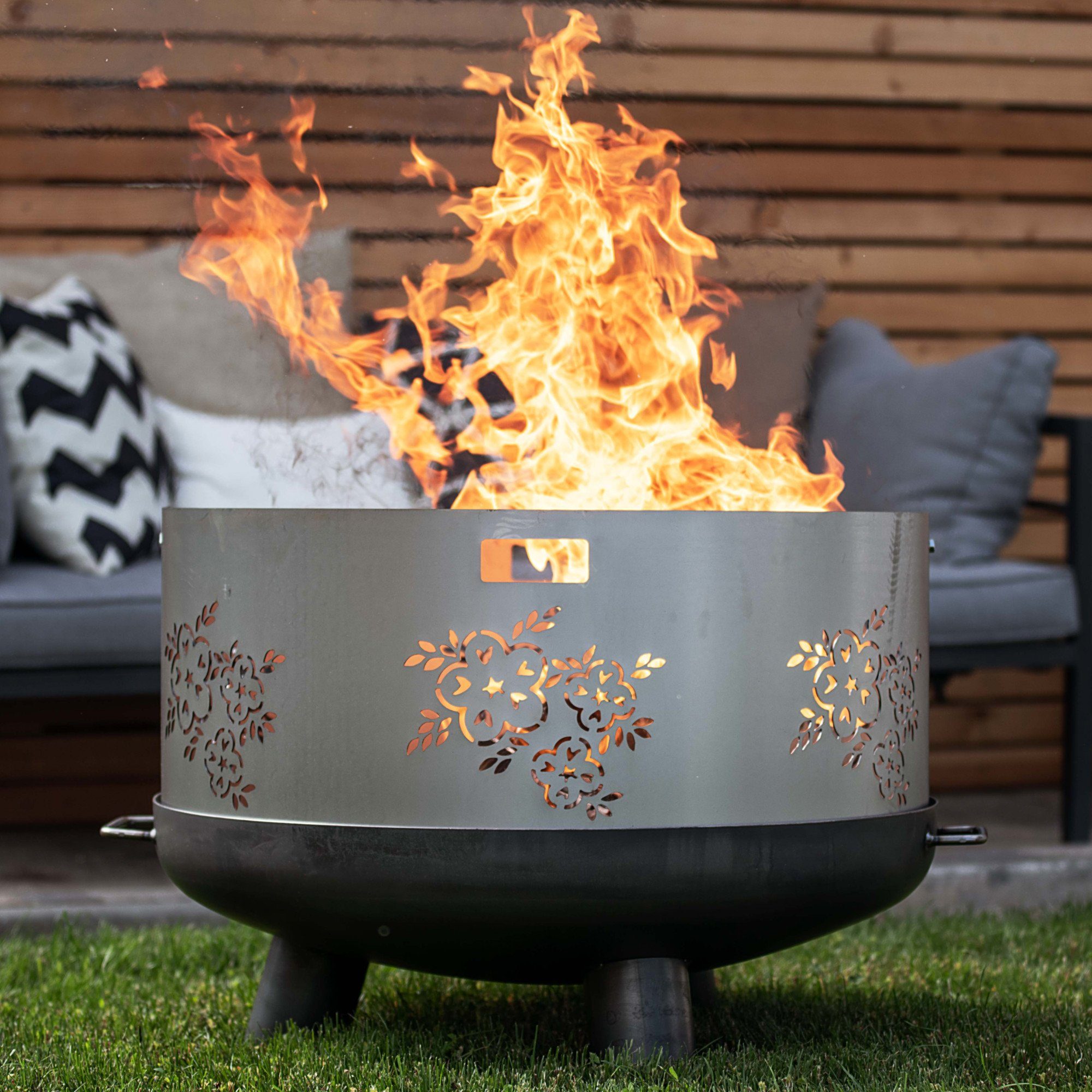 Mit unserem Funkenschutz Ring für deine Feuerschale gewinnst Du das extra an Sicherheit das Du bei windigem Wetter an Deiner Feuerschale brauchst. Unser Funkenschutz erhöht den Rand der deiner Feuerschale so das springende Funken ihren Weg nur schwer aus der Feuerschale finden. Mit dem wunderschönen Blumenmotiv bleibt dir dennoch die romantische Atmosphäre im schein des Feuers nicht verborgen und zaubert ein herrliches Flammenspiel in die Nacht. In perfekter Harmonie ergänzt dieser Feuerschalen-Aufsatz deine Feuerschale aus Stahl.