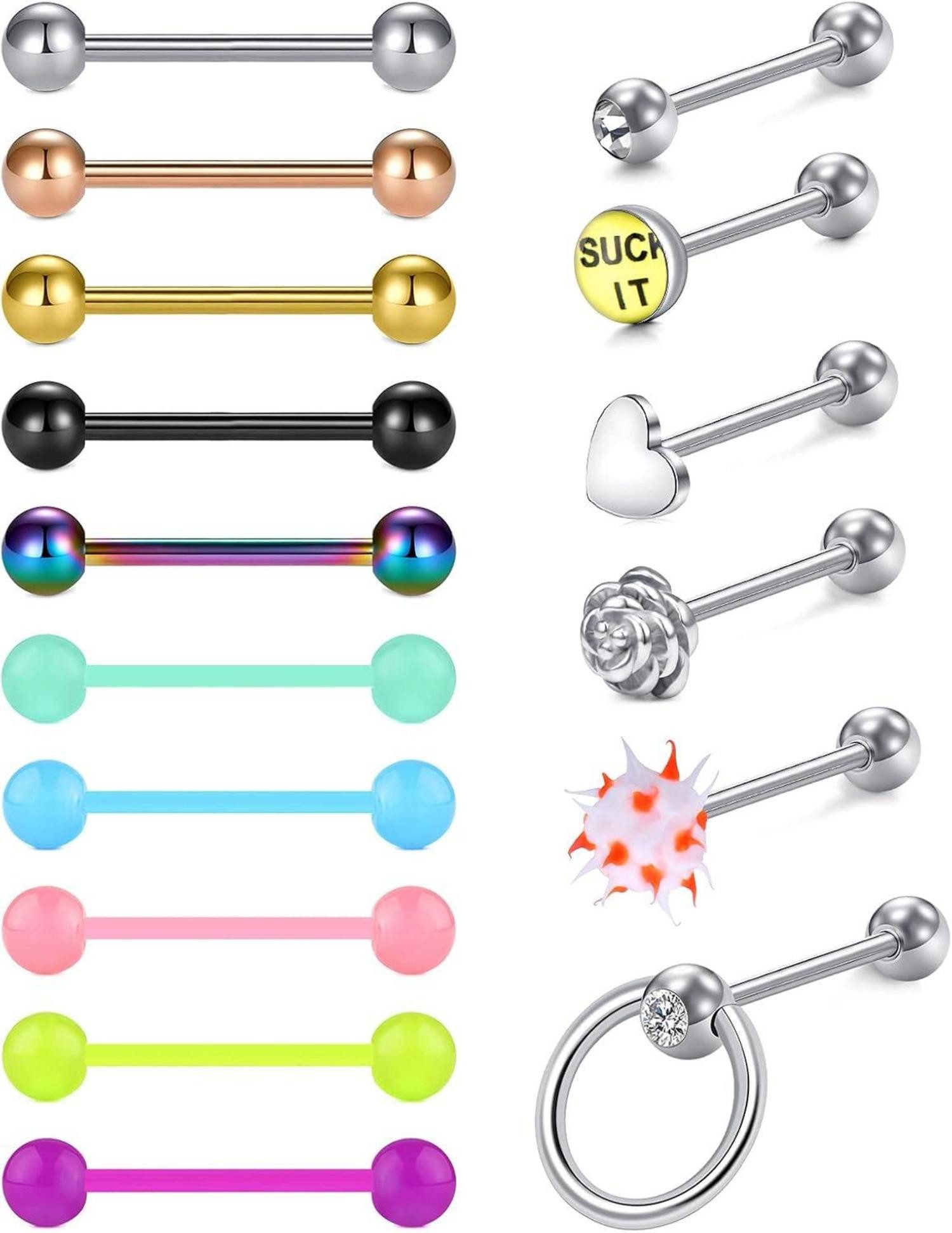 Die Piercings haben eine Gauge Размер von 14G (1.6mm) und eine Stablänge von 16mm, perfekt für Zungen- oder Nippelpiercings. Hergestellt aus hochwertigem Chirurgenstahl und flexiblem Kunststoff, sind sie langlebig, bequem und sicher für empfindliche Haut.