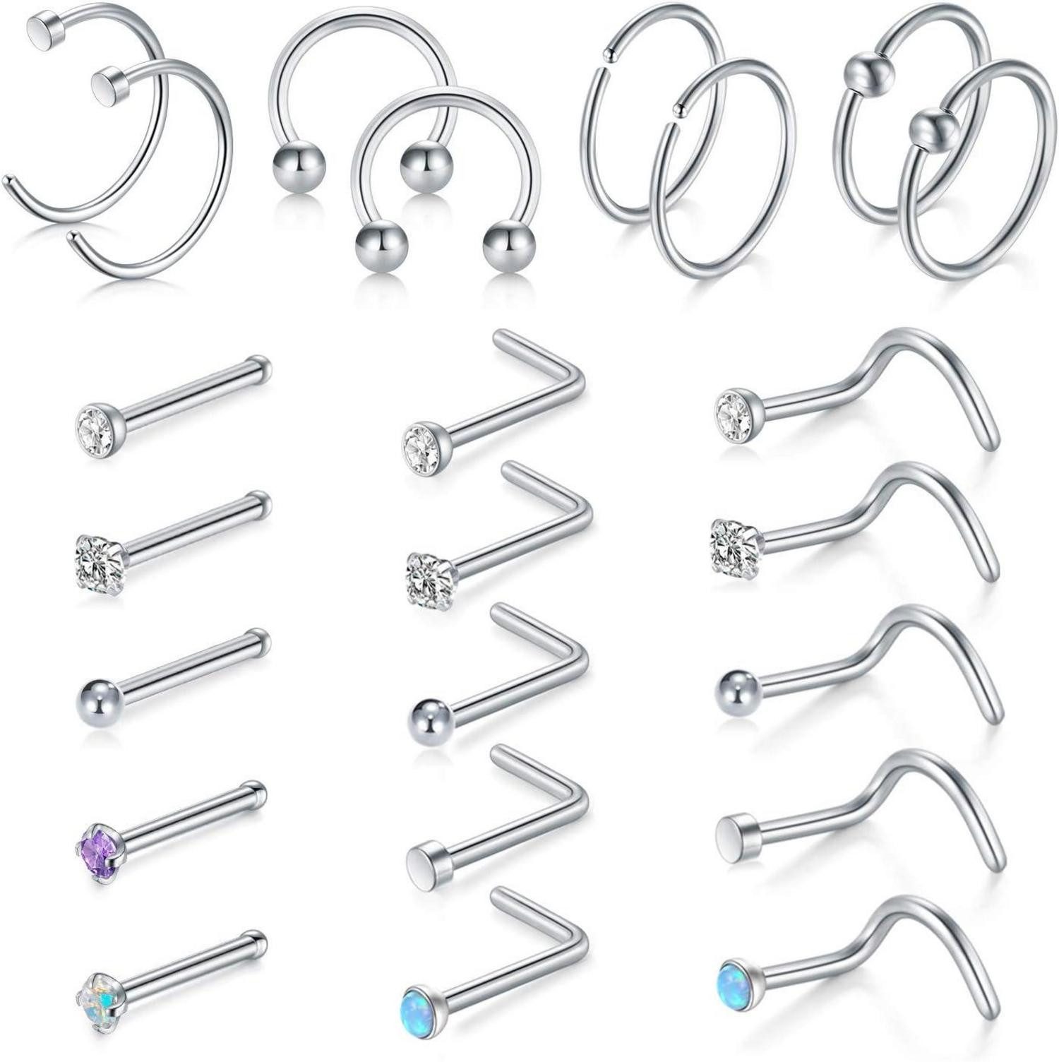 Dank des hochwertigen 316L Chirurgenstahls sind sie besonders hautfreundlich, allergenfrei und langlebig. Jedes Set enthält insgesamt 23 Stück, darunter 8 Nasenringe in 4 verschiedenen Stilen und 15 Nasenstecker in 3 verschiedenen Formen, alles in kühlem Silber gehalten. Die glänzend polierte Oberfläche verleiht jedem Nasenring und Nasenstecker einen eleganten Touch.